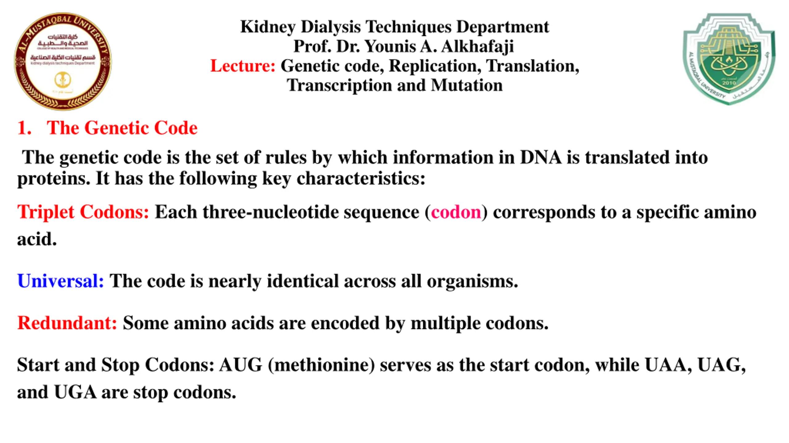 Kidney Dialysis Techniques Department Prof. Dr. Younis A. Alkhafaji Lecture: Genetic code, Replication, Translation, Transcription and Mutation 1. The Genetic Code The genetic code is the set of rules by which information in DNA is translated into proteins. It has the following key characteristics: Triplet Codons: Each three-nucleotide sequence (codon) corresponds to a specific amino acid. Universal: The code is nearly identical across all organisms. Redundant: Some amino acids are encoded by multiple codons. Start and Stop Codons: AUG (methionine) serves as the start codon, while UAA, UAG, and UGA are stop codons.