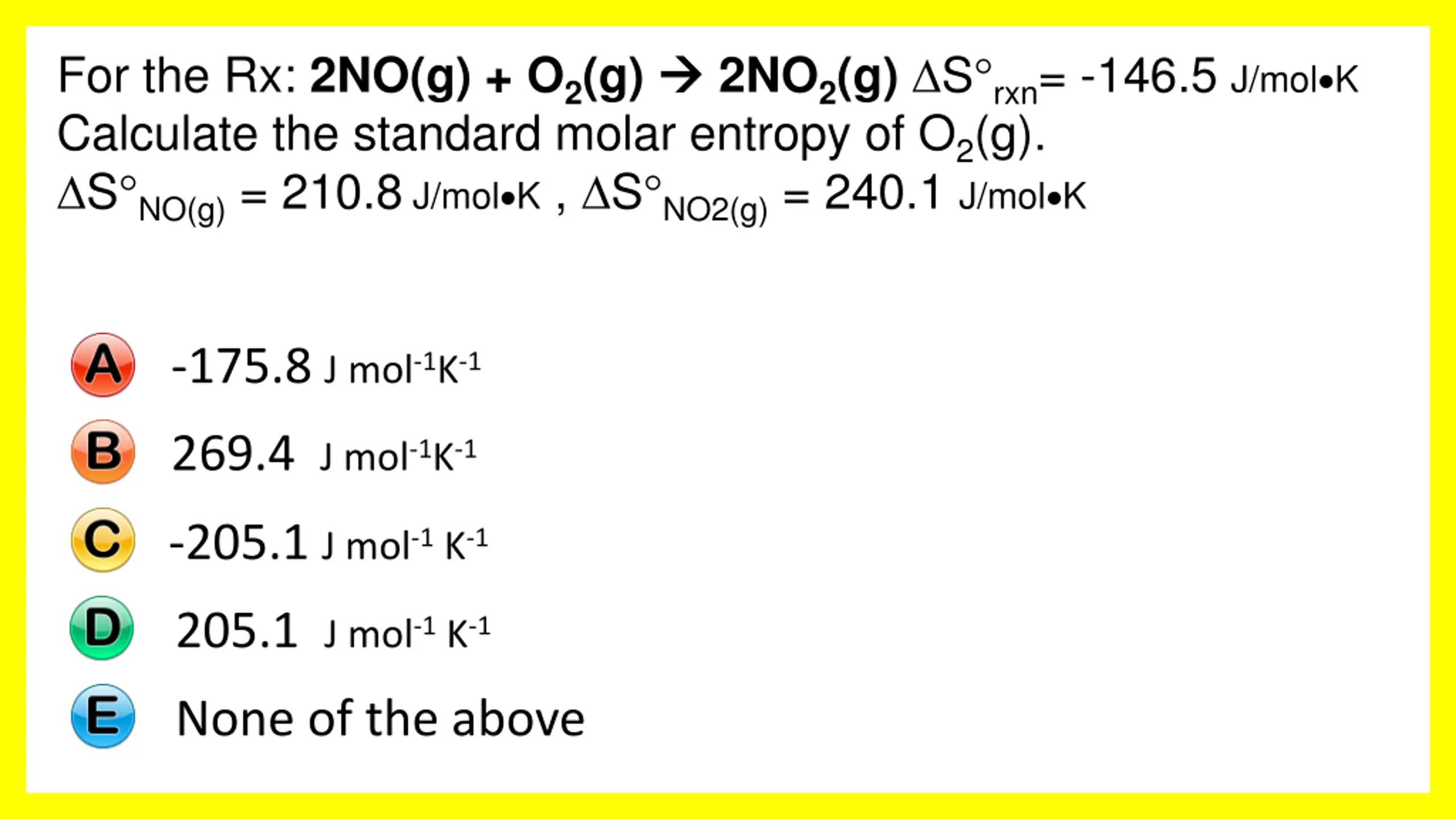 2NO2(g) Srxn= -146.5 J/molK For the Rx: 2NO(g) + O2(g) Calculate the standard molar entropy of O2(g). S NO(g) = 210.8 J/mol K , S NO2(g) = 240.1 J/mol K -175.8 J mol-1K-1 269.4 J mol-1K-1 -205.1 J mol-1 K-1 205.1 J mol-1 K-1 None of the above
