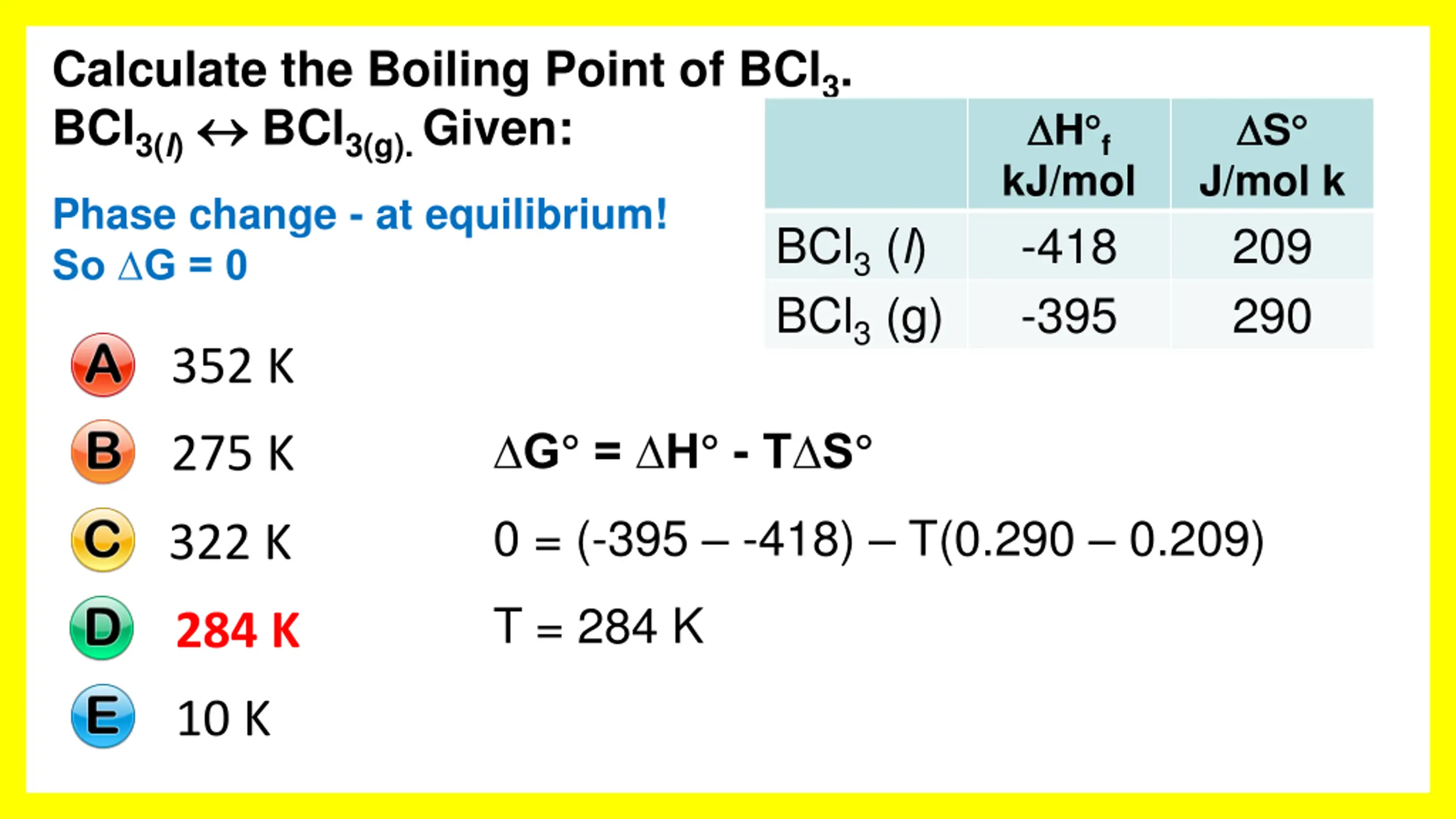Calculate the Boiling Point of BCl3. BCl3(l) BCl3(g). Given: H f kJ/mol -418 -395 S J/mol k 209 290 BCl3 (l) BCl3 (g) 352 K 275 K 322 K 284 K 10 K