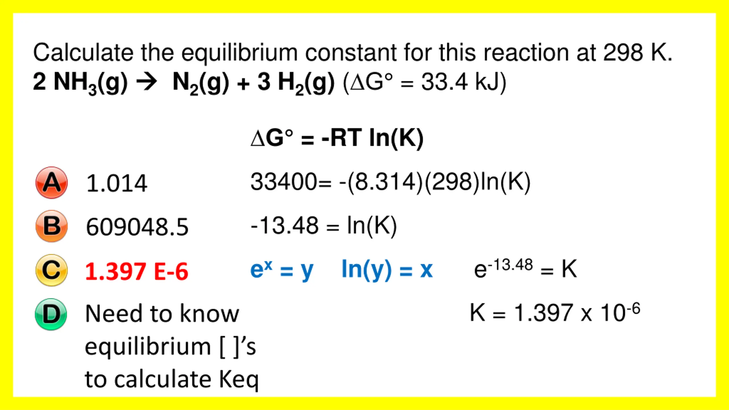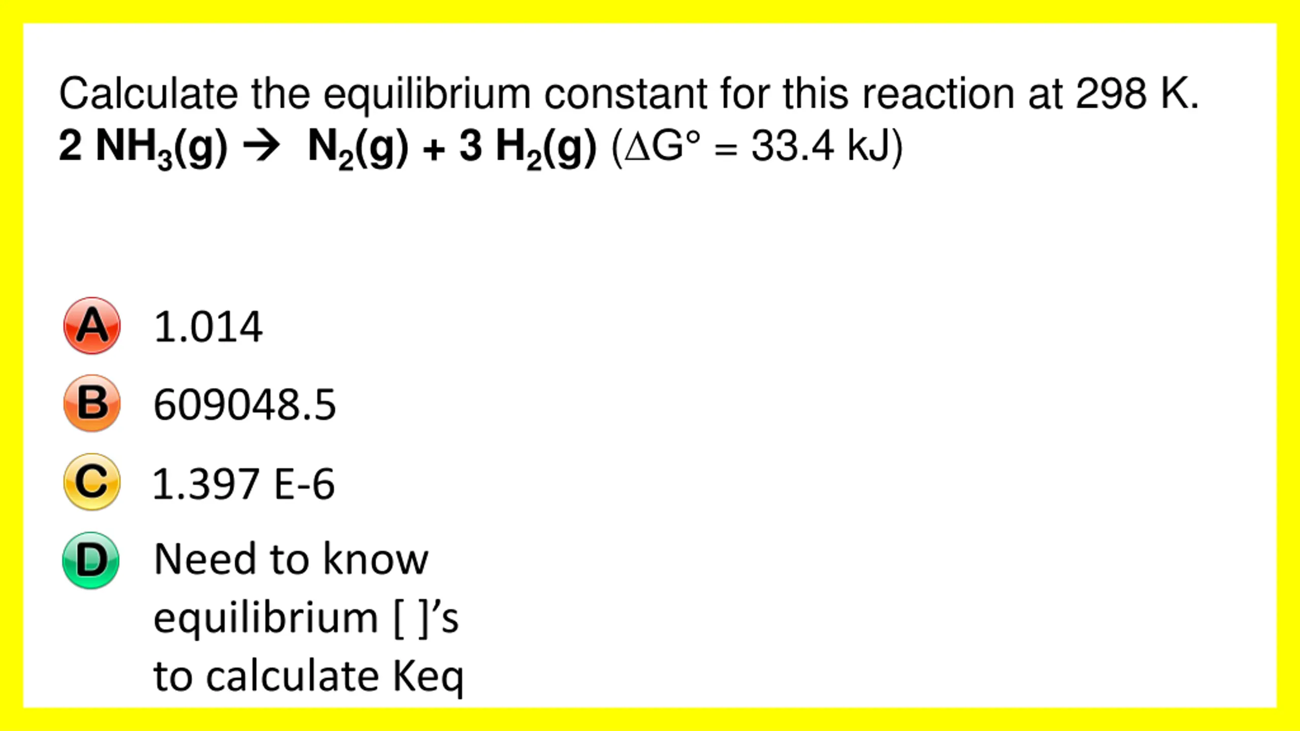 Calculate the equilibrium constant for this reaction at 298 K. 2 NH3(g) N2(g) + 3 H2(g) ( G = 33.4 kJ) 1.014 609048.5 1.397 E-6 Need to know equilibrium [ ] s to calculate Keq