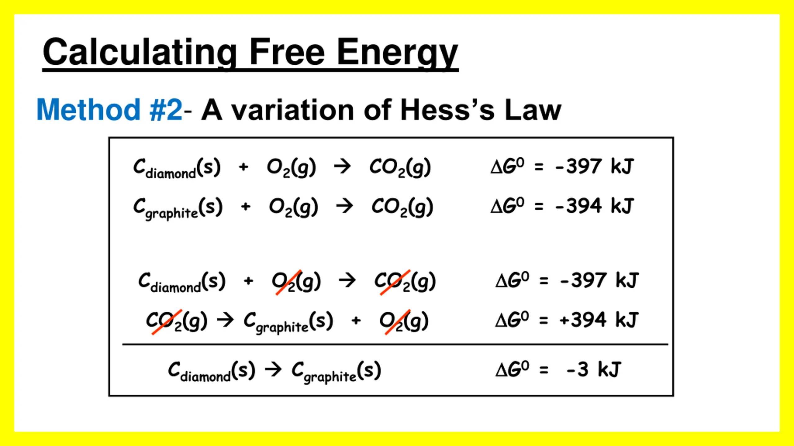 Calculating Free Energy Method #2- A variation of Hess s Law Cdiamond(s) + O2(g) Cgraphite(s) + O2(g) CO2(g) CO2(g) G0 = -397 kJ G0 = -394 kJ Cdiamond(s) + O2(g) CO2(g) G0 = -397 kJ CO2(g) Cgraphite(s) + O2(g) G0 = +394 kJ -3 kJ Cdiamond(s) Cgraphite(s) G0 =