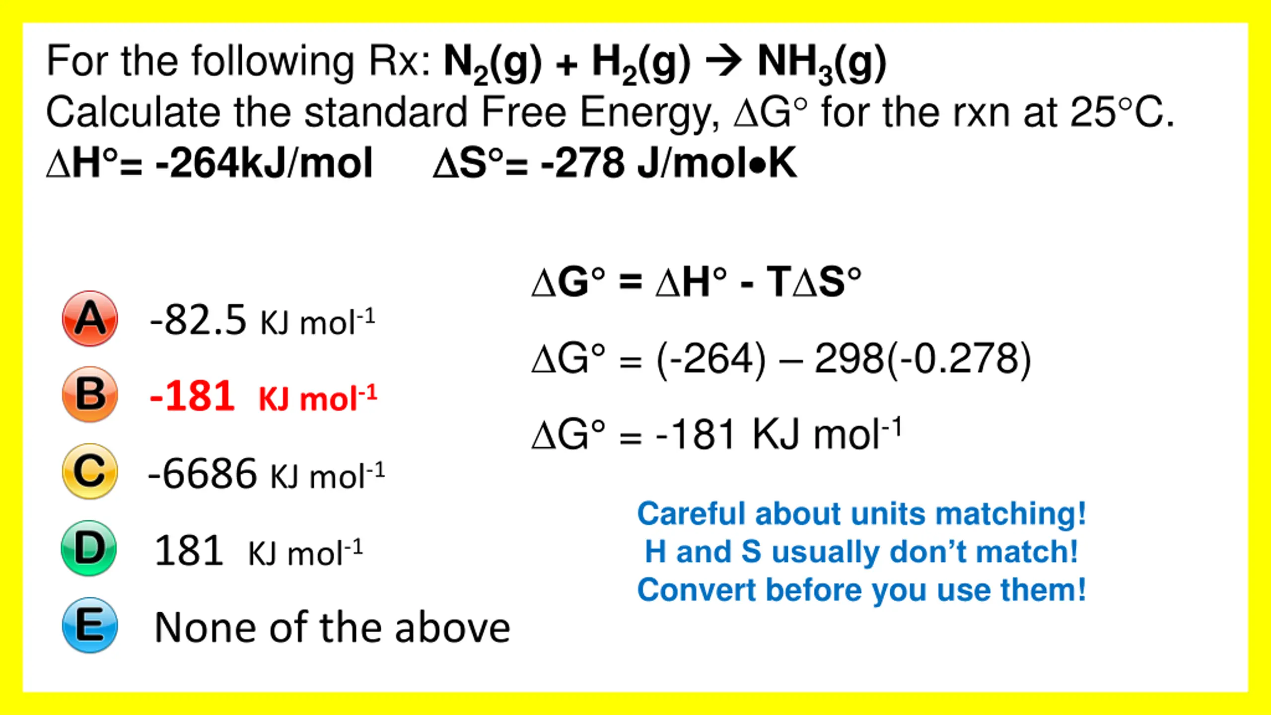 For the following Rx: N2(g) + H2(g) Calculate the standard Free Energy, G for the rxn at 25 C. H = -264kJ/mol S = -278 J/mol K NH3(g) G = H - T S -82.5 KJ mol-1 G = (-264) 298(-0.278) -181 KJ mol-1 G = -181 KJ mol-1 -6686 KJ mol-1 Careful about units matching! H and S usually don t match! Convert before you use them! 181 KJ mol-1 None of the above