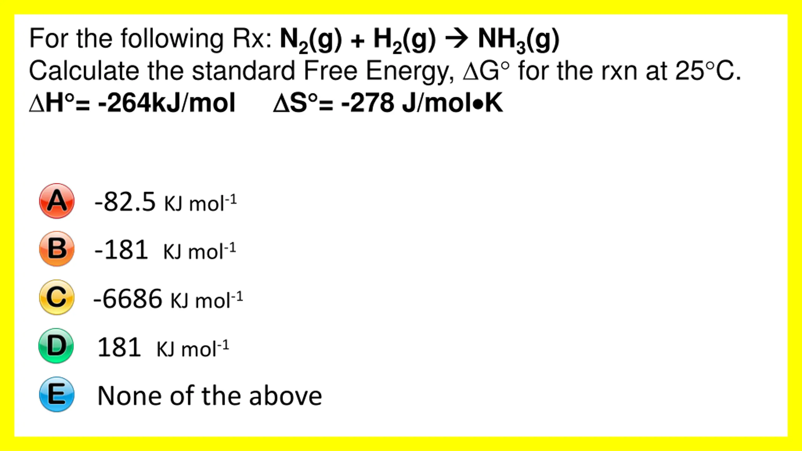 For the following Rx: N2(g) + H2(g) Calculate the standard Free Energy, G for the rxn at 25 C. H = -264kJ/mol S = -278 J/mol K NH3(g) -82.5 KJ mol-1 -181 KJ mol-1 -6686 KJ mol-1 181 KJ mol-1 None of the above