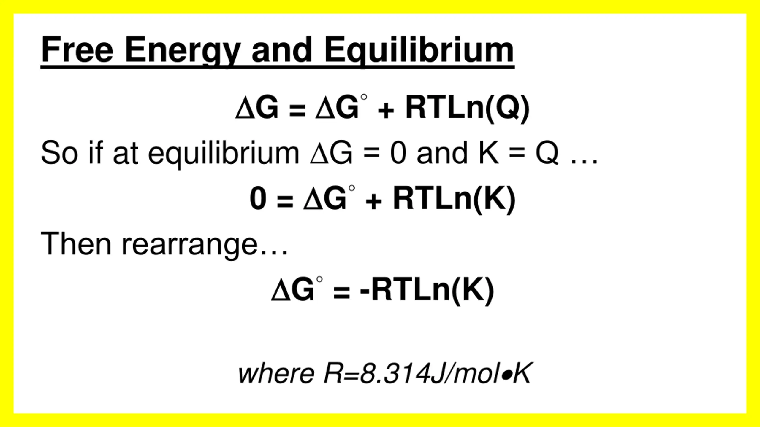 Free Energy and Equilibrium G = G + RTLn(Q) So if at equilibrium G = 0 and K = Q 0 = G + RTLn(K) Then rearrange G = -RTLn(K) where R=8.314J/mol K