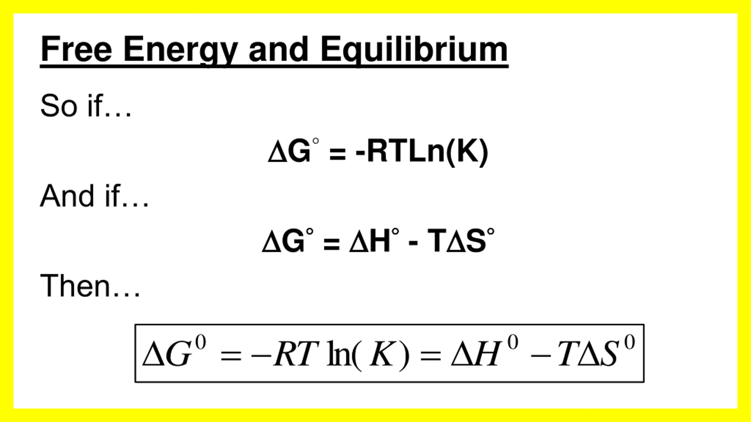 Free Energy and Equilibrium So if G = -RTLn(K) And if G = H - T S Then = = 0 0 0 ln( ) G RT K H T S