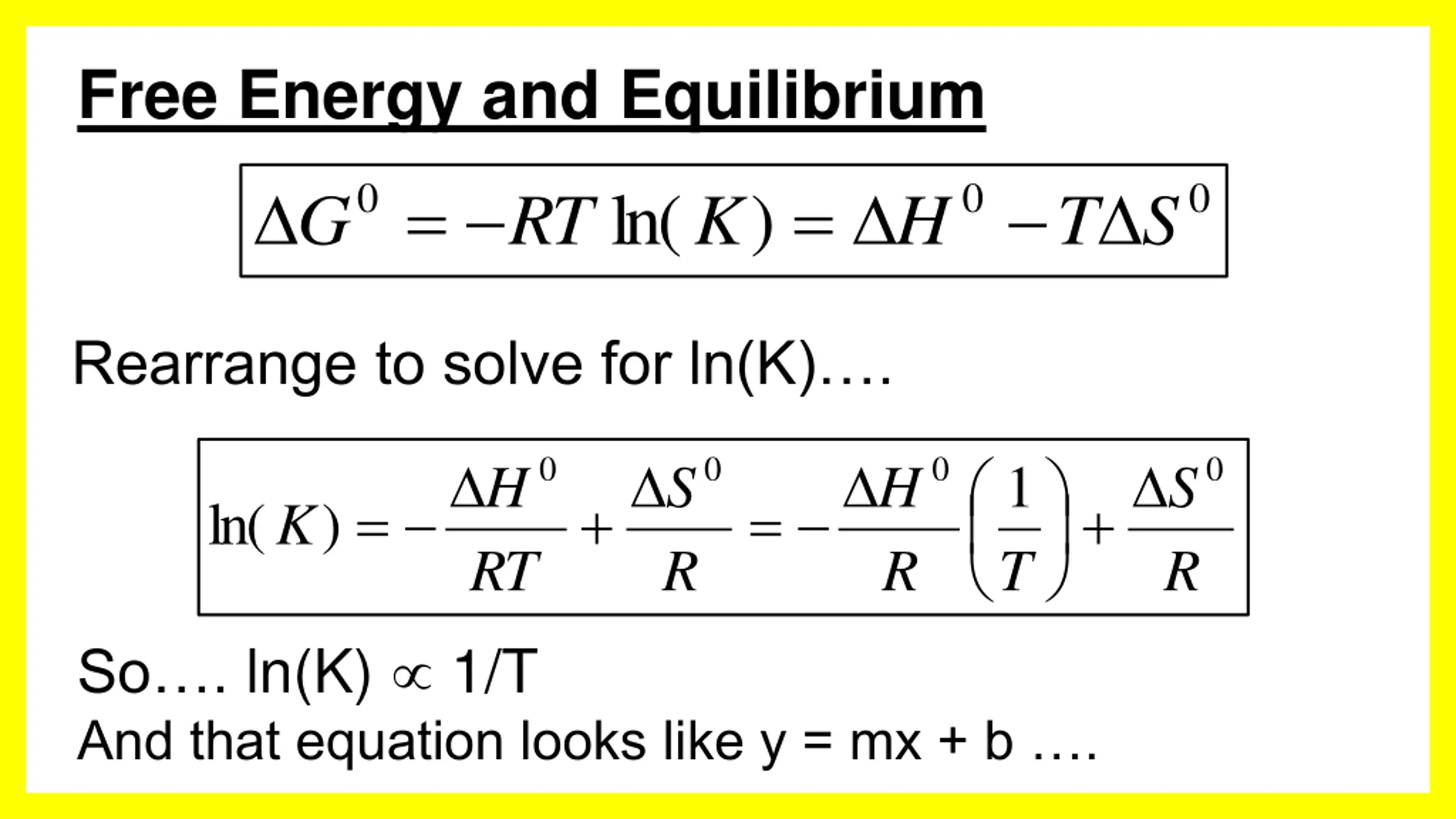 Free Energy and Equilibrium = = 0 0 0 ln( ) G RT K H T S Rearrange to solve for ln(K) . 0 0 0 0 1 H S H S = + = + ln( ) K RT R R T R So . ln(K) 1/T And that equation looks like y = mx + b .