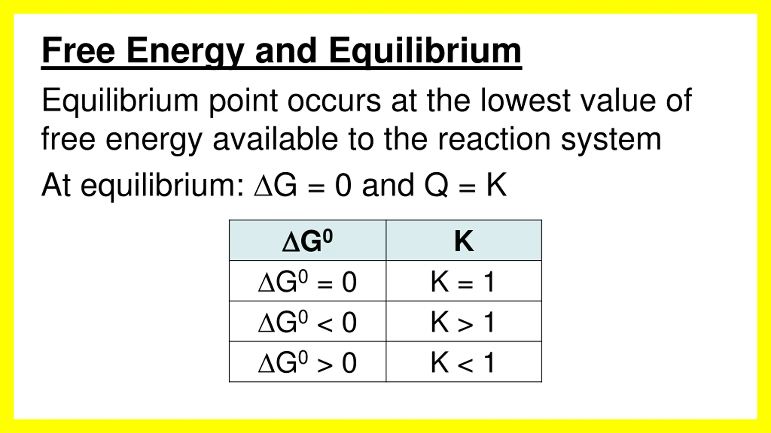 Free Energy and Equilibrium Equilibrium point occurs at the lowest value of free energy available to the reaction system At equilibrium: G= 0 and Q = K G0 G0 = 0 G0 < 0 G0 > 0 K K = 1 K > 1 K < 1