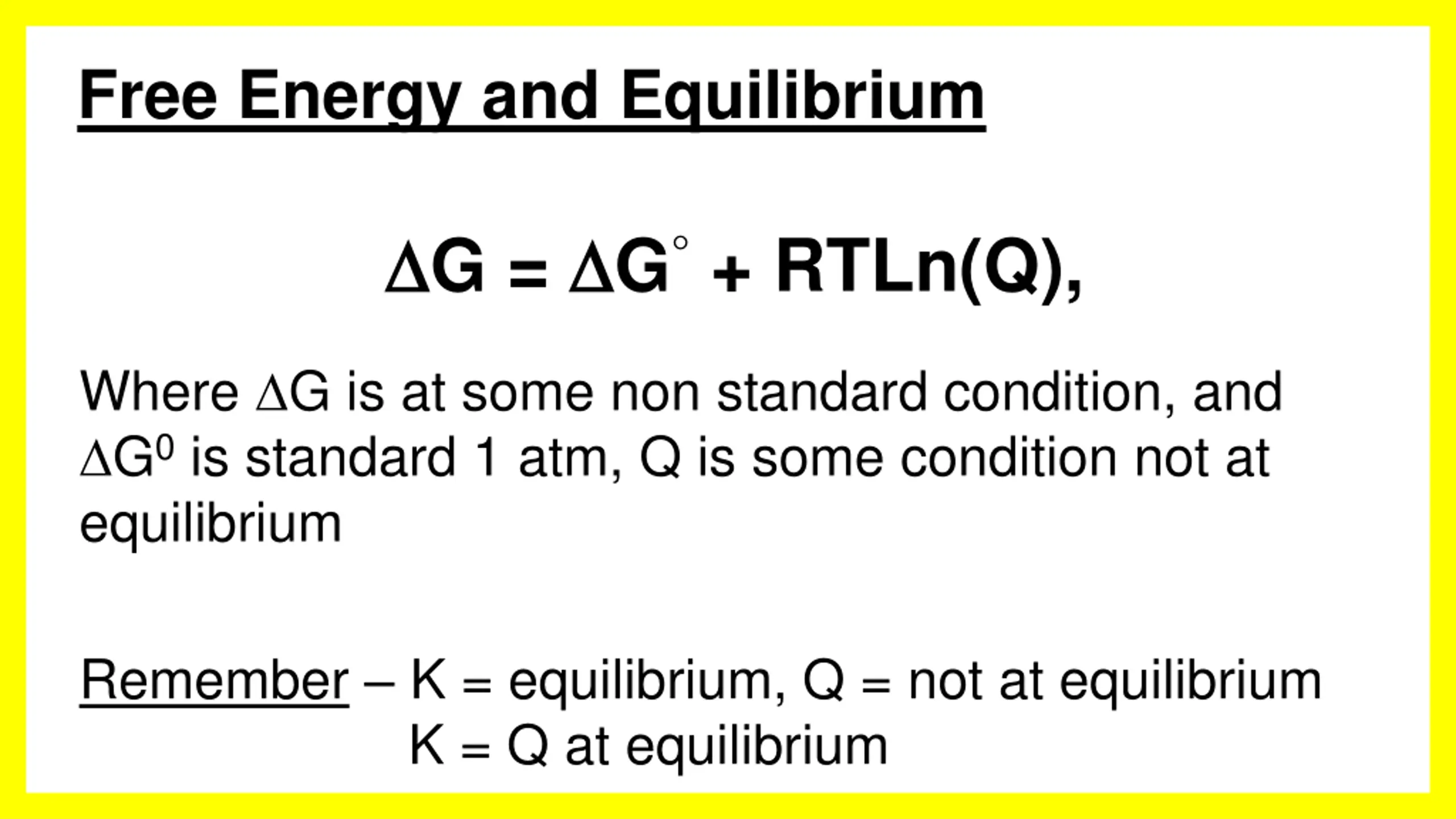 Free Energy and Equilibrium G = G + RTLn(Q), Where G is at some non standard condition, and G0 is standard 1 atm, Q is some condition not at equilibrium Remember K = equilibrium, Q = not at equilibrium K = Q at equilibrium