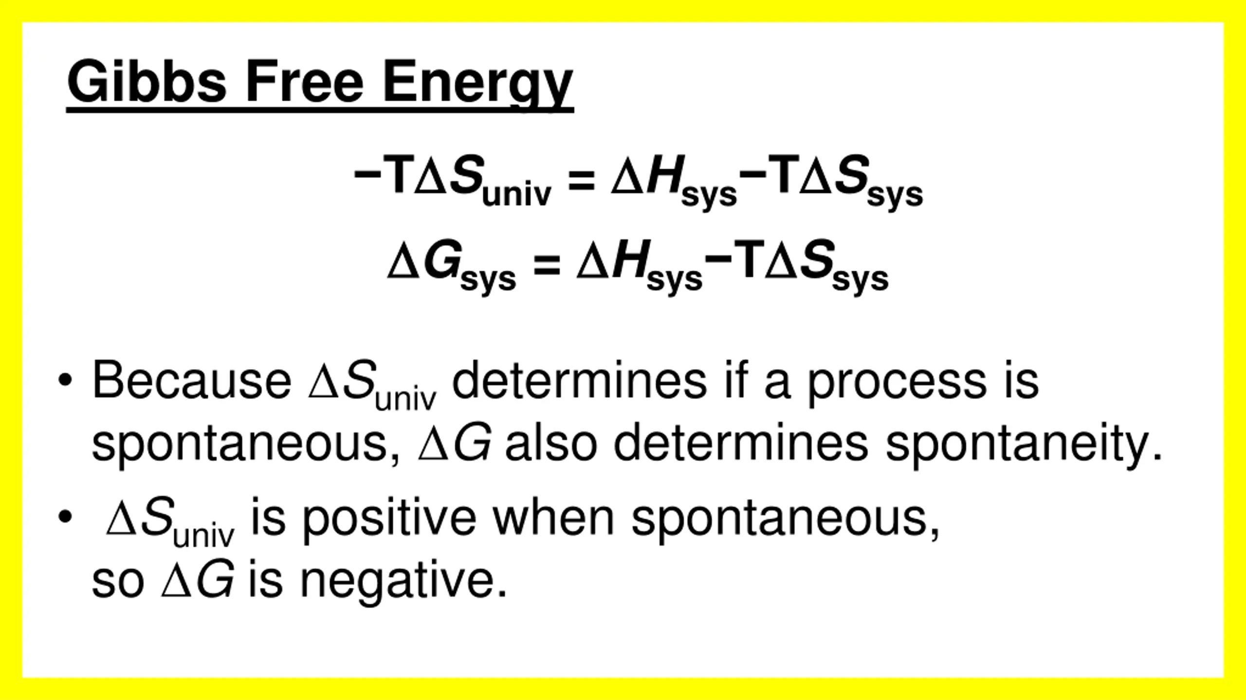 Gibbs Free Energy T Suniv = Hsys T Ssys Gsys = Hsys T Ssys Because Suniv determines if a process is spontaneous, G also determines spontaneity. Suniv is positive when spontaneous, so G is negative.