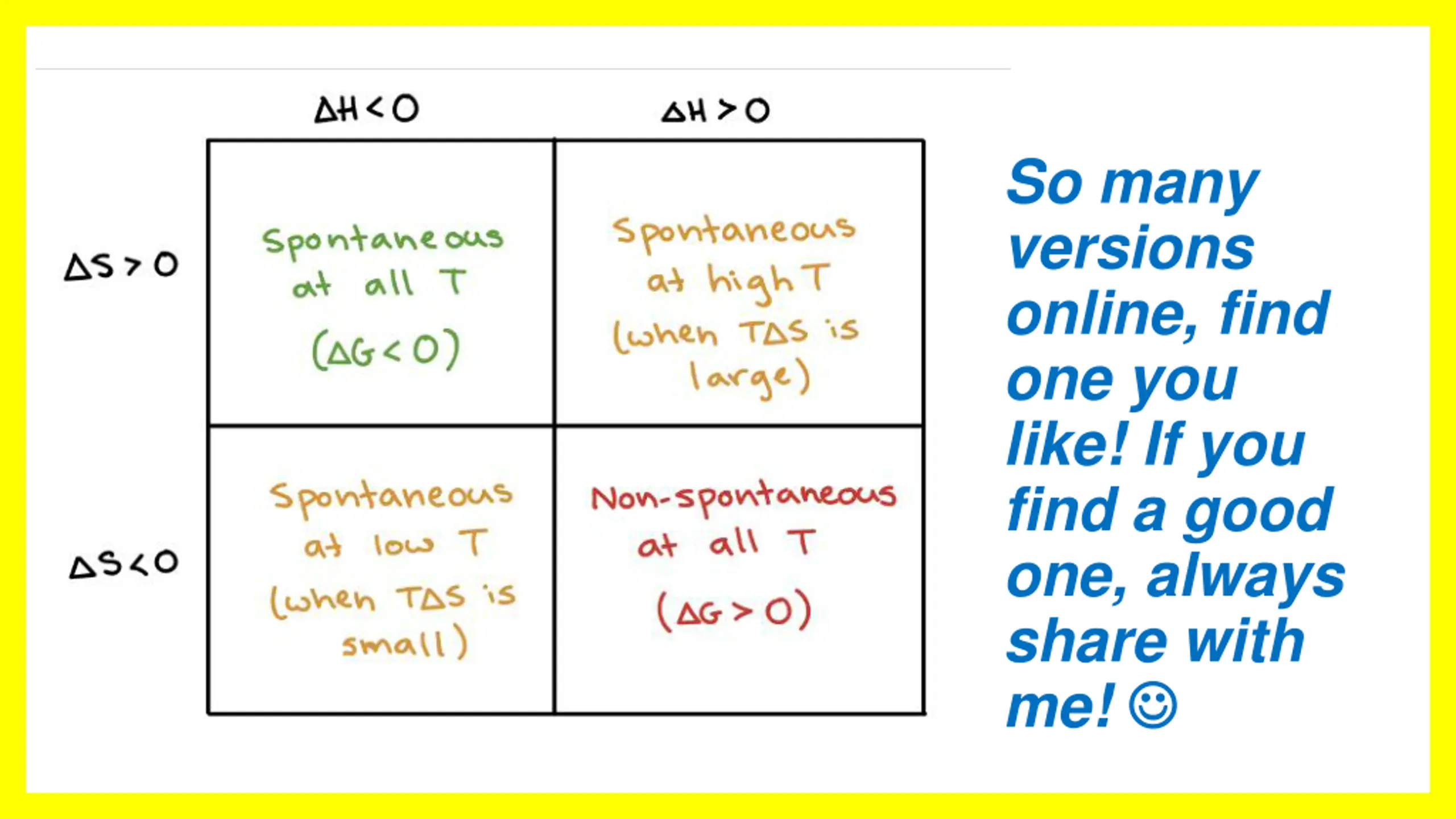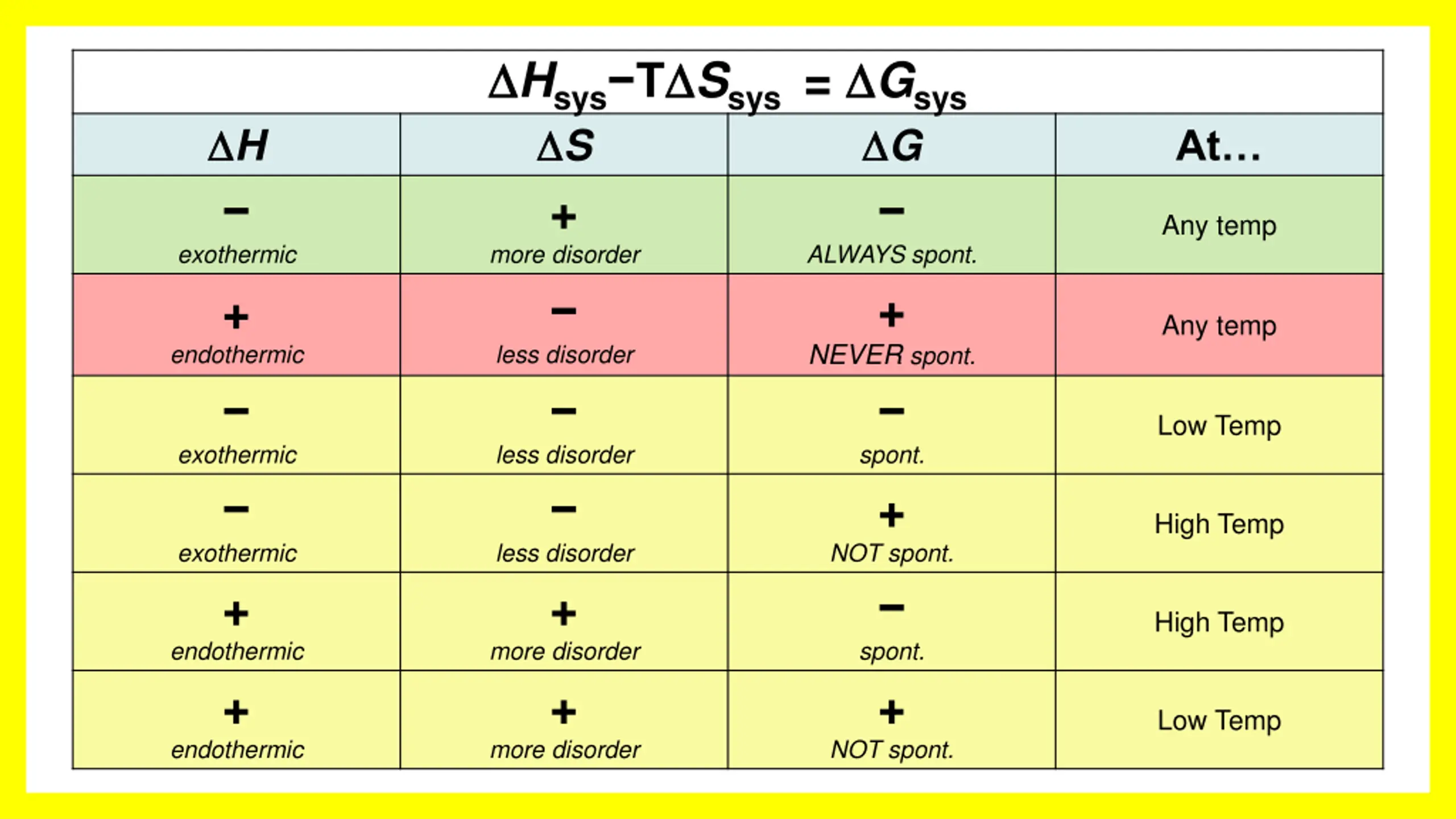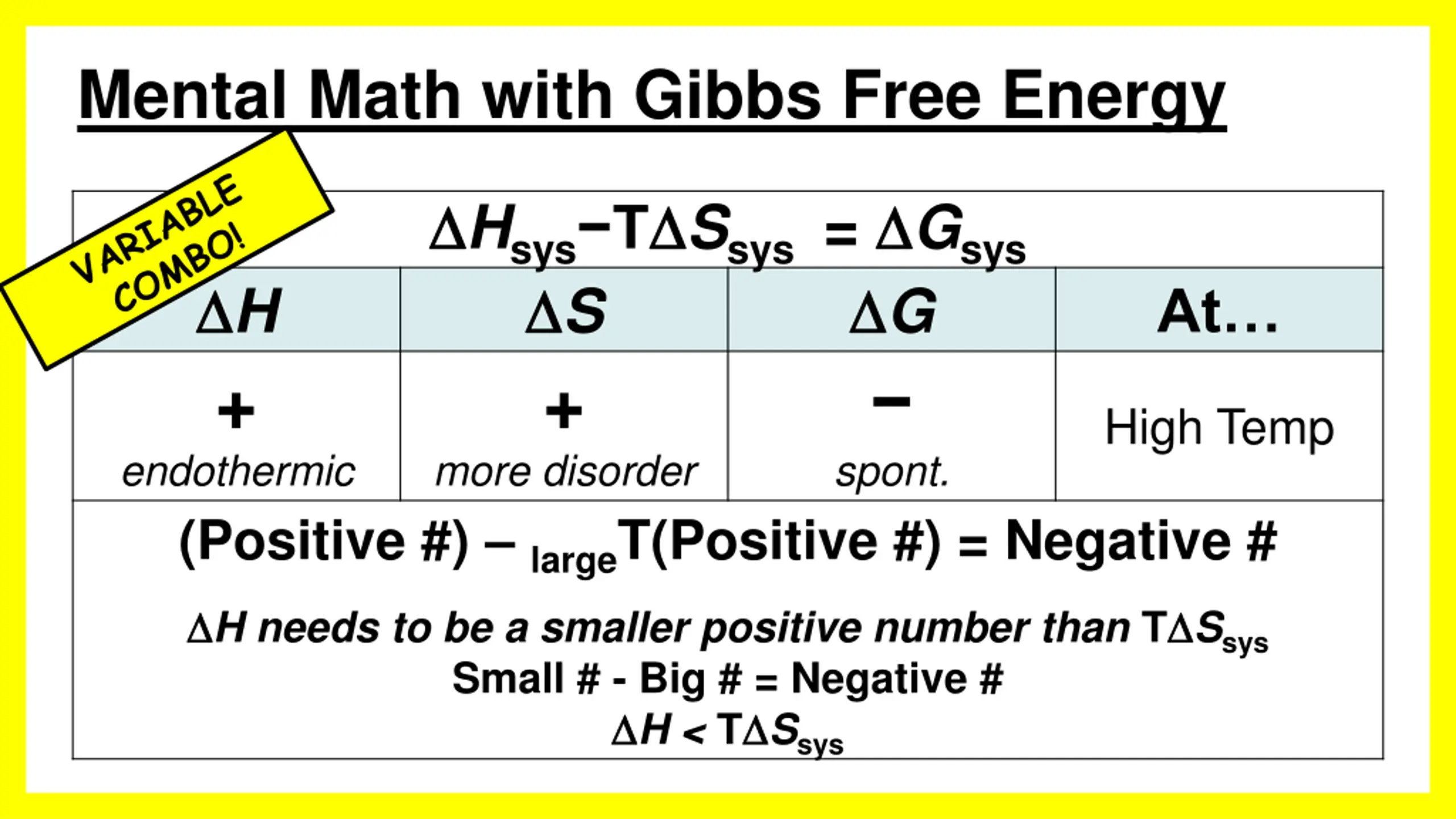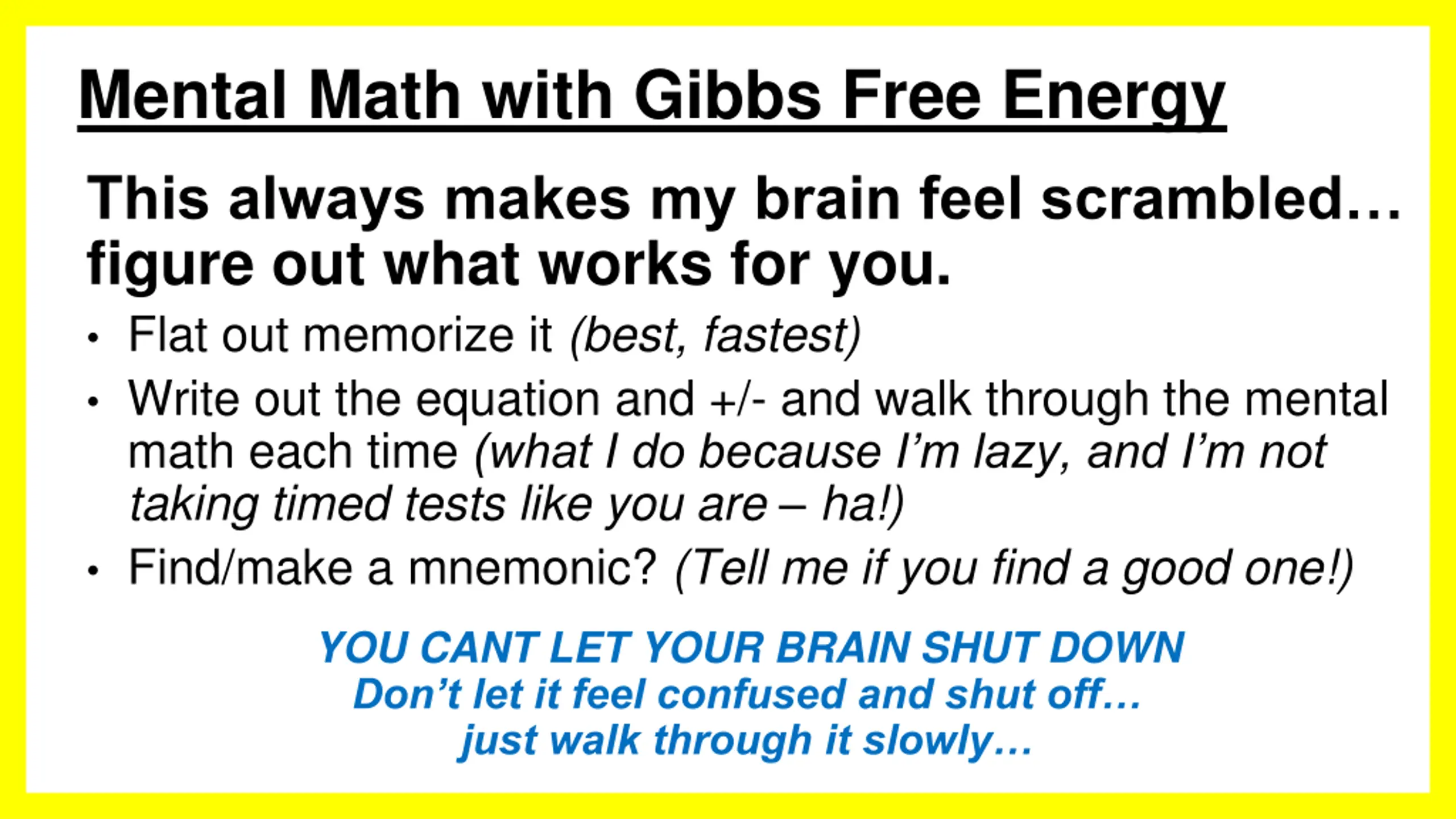 Mental Math with Gibbs Free Energy This always makes my brain feel scrambled figure out what works for you. Flat out memorize it (best, fastest) Write out the equation and +/- and walk through the mental math each time (what I do because I m lazy, and I m not taking timed tests like you are ha!) Find/make a mnemonic? (Tell me if you find a good one!) YOU CANT LET YOUR BRAIN SHUT DOWN Don t let it feel confused and shut off just walk through it slowly