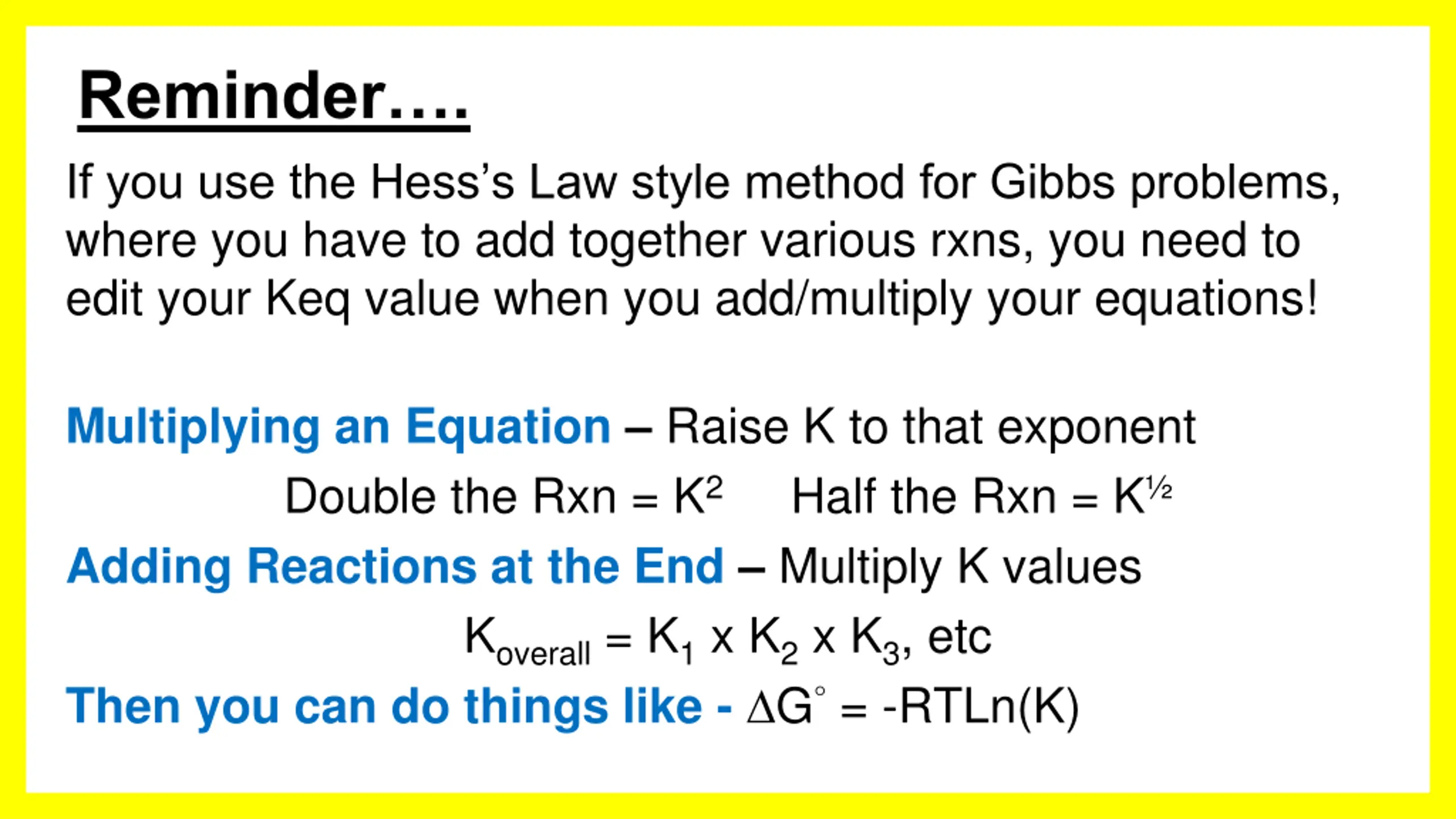 Reminder. If you use the Hess s Law style method for Gibbs problems, where you have to add together various rxns, you need to edit your Keq value when you add/multiply your equations! Multiplying an Equation Raise K to that exponent Double the Rxn = K2 Half the Rxn = K Adding Reactions at the End Multiply K values Koverall = K1 x K2 x K3, etc Then you can do things like - G = -RTLn(K)