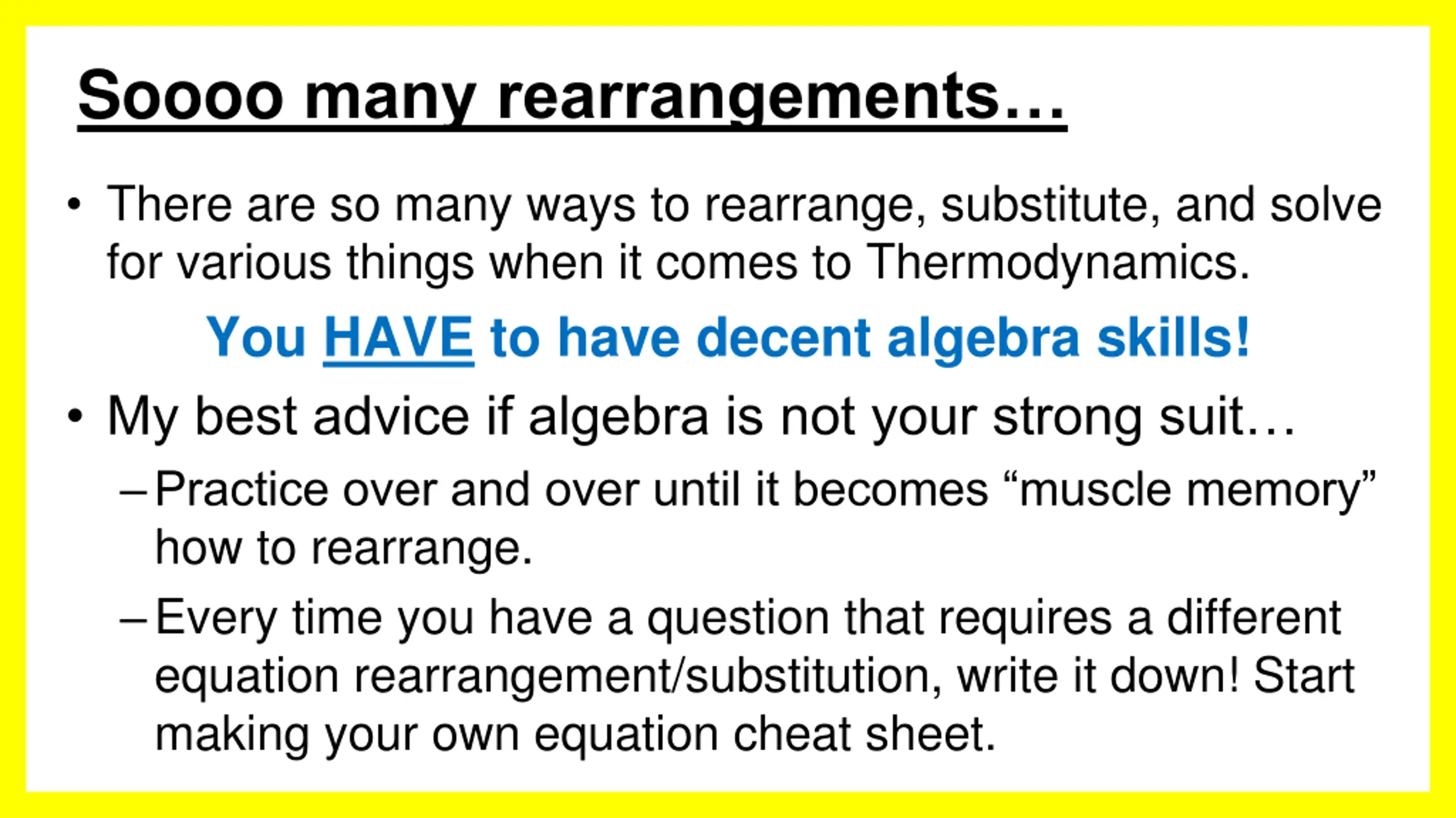 Soooo many rearrangements There are so many ways to rearrange, substitute, and solve for various things when it comes to Thermodynamics. You HAVE to have decent algebra skills! My best advice if algebra is not your strong suit Practice over and over until it becomes muscle memory how to rearrange. Every time you have a question that requires a different equation rearrangement/substitution, write it down! Start making your own equation cheat sheet.