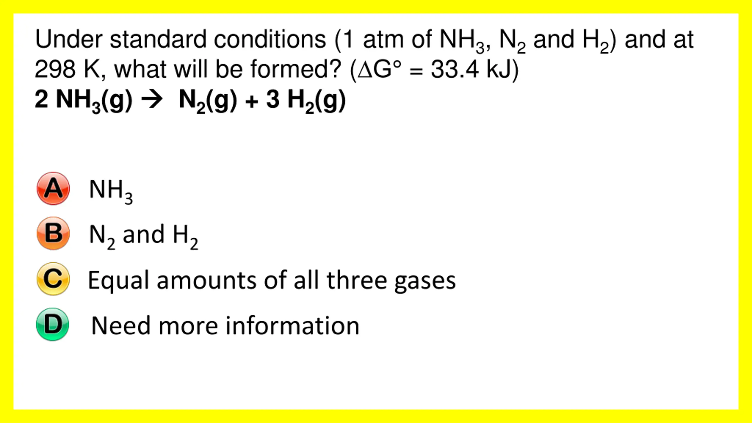 Under standard conditions (1 atm of NH3, N2 and H2) and at 298 K, what will be formed? ( G = 33.4 kJ) 2 NH3(g) N2(g) + 3 H2(g) NH3 N2 and H2 Equal amounts of all three gases Need more information