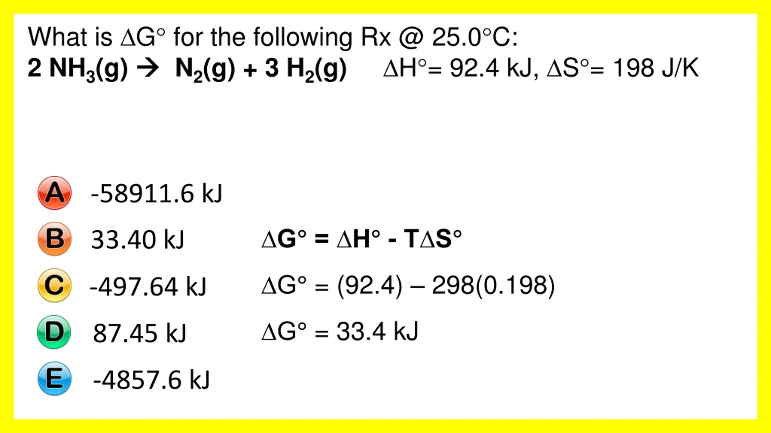 What is G for the following Rx @ 25.0C: 2 NH3(g) N2(g) + 3 H2(g) H = 92.4 kJ, S = 198 J/K -58911.6 kJ G = H - T S 33.40 kJ G = (92.4) 298(0.198) -497.64 kJ G = 33.4 kJ 87.45 kJ -4857.6 kJ