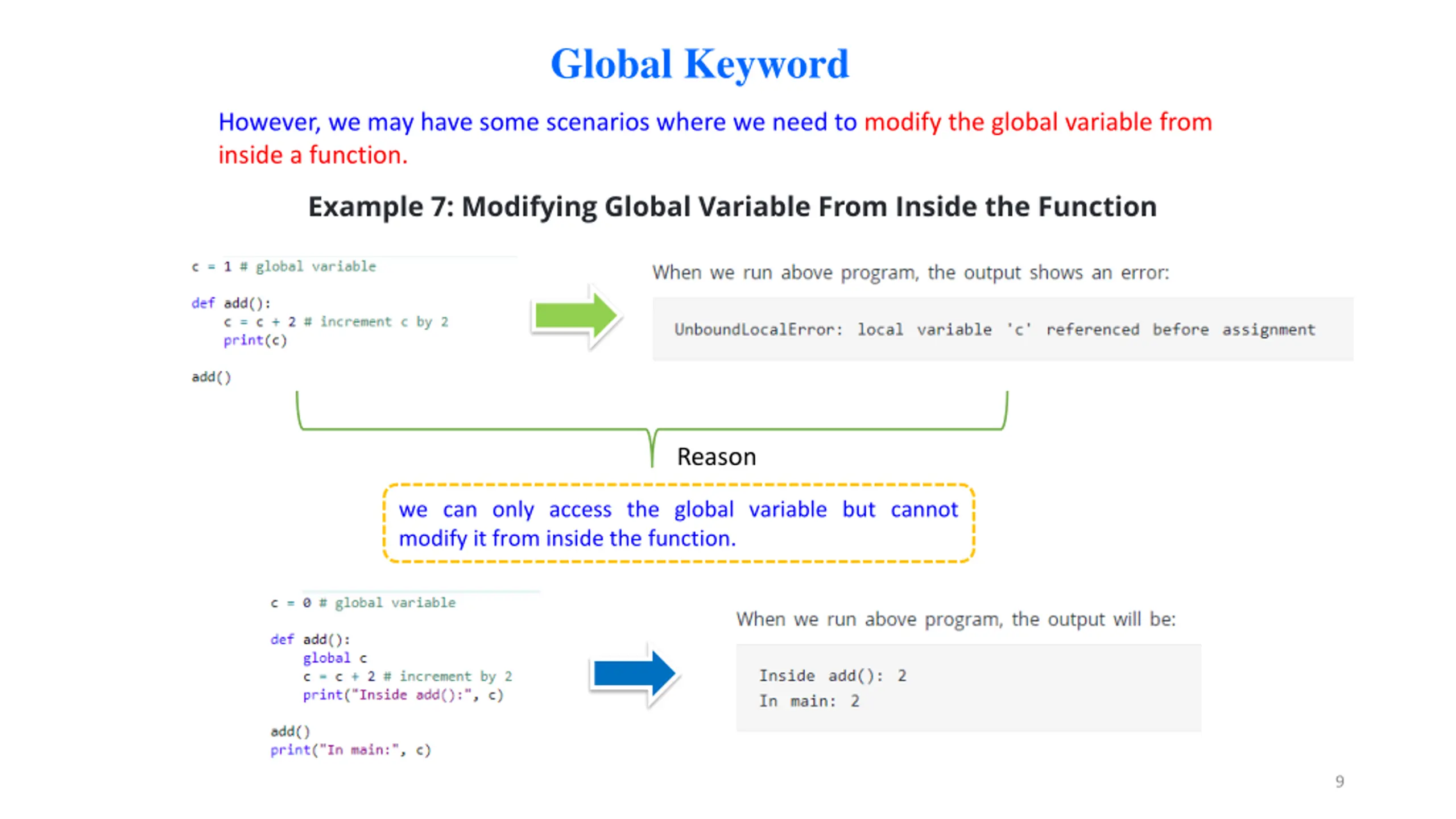 Global Keyword However, we may have some scenarios where we need to modify the global variable from inside a function. Example 7: Modifying Global Variable From Inside the Function Reason we can only access the global variable but cannot modify it from inside the function. 9