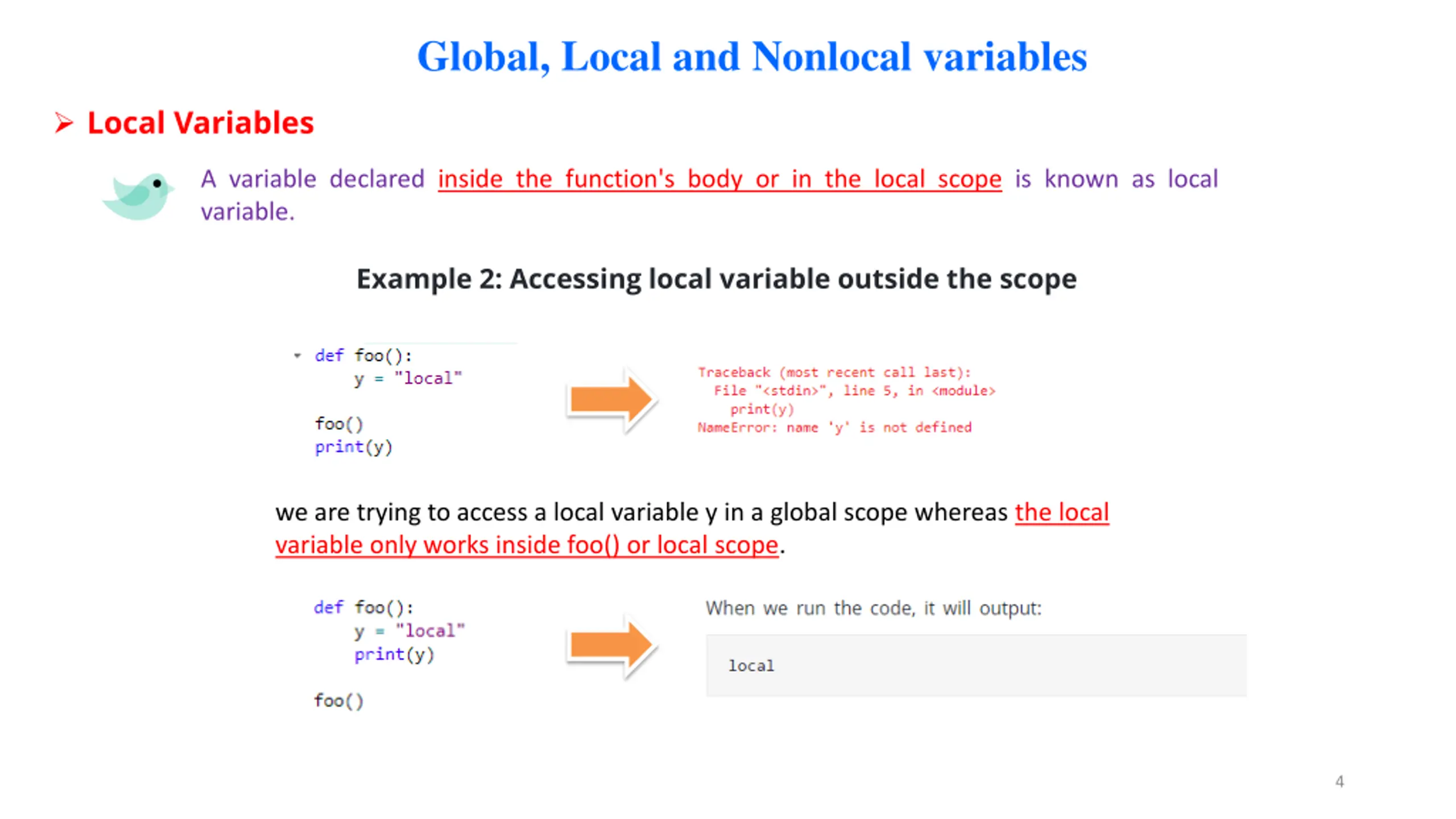 Global, Local and Nonlocal variables Local Variables A variable declared inside the function's body or in the local scope is known as local variable. Example 2: Accessing local variable outside the scope we are trying to access a local variable y in a global scope whereas the local variable only works inside foo() or local scope. 4