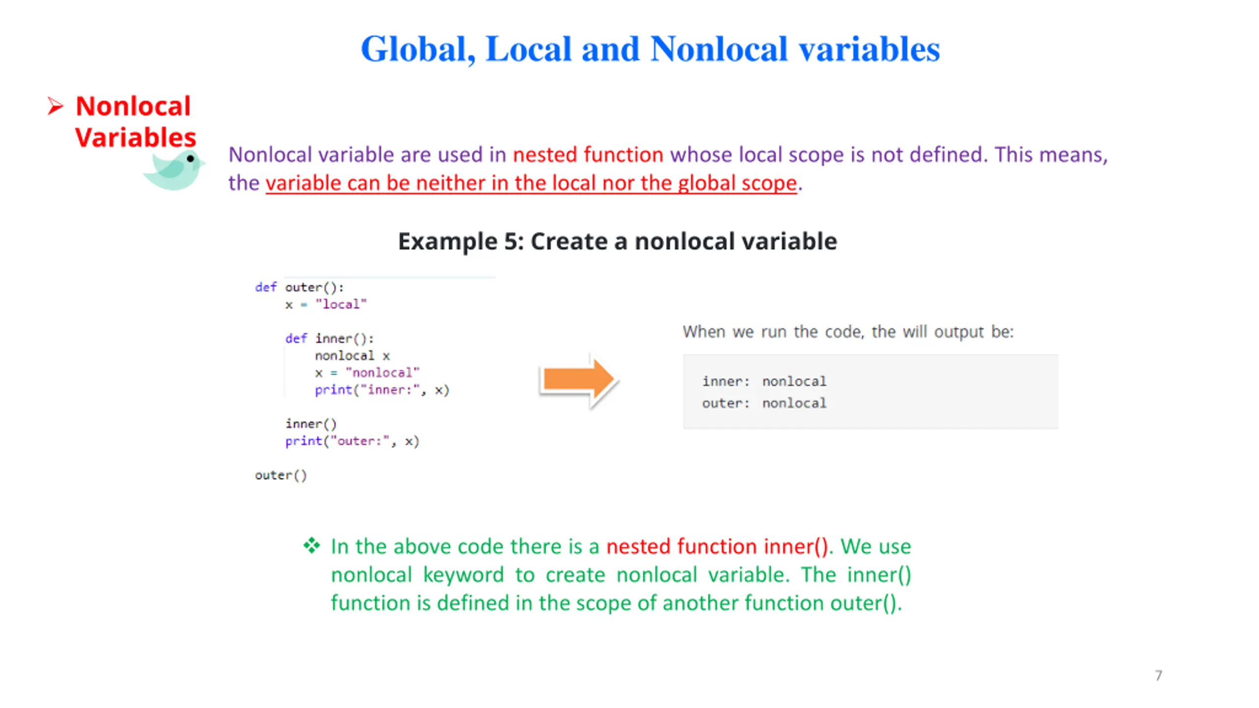 Global, Local and Nonlocal variables Nonlocal Variables Nonlocal variable are used in nested function whose local scope is not defined. This means, the variable can be neither in the local nor the global scope. Example 5: Create a nonlocal variable In the above code there is a nested function inner(). We use nonlocal keyword to create nonlocal variable. The inner() function is defined in the scope of another function outer(). 7