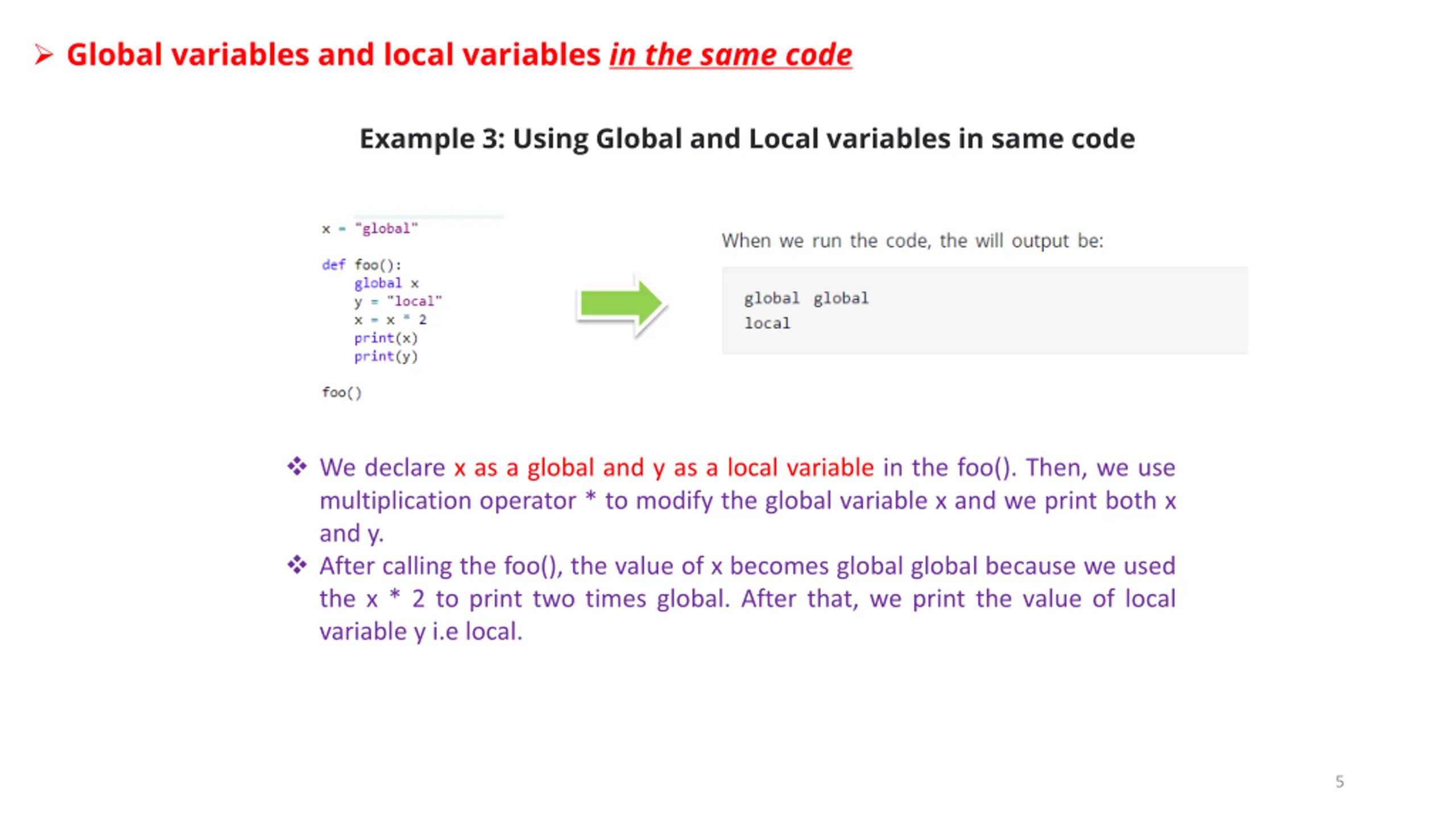 Global variables and local variables in the same code Example 3: Using Global and Local variables in same code We declare x as a global and y as a local variable in the foo(). Then, we use multiplication operator * to modify the global variable x and we print both x and y. After calling the foo(), the value of x becomes global global because we used the x * 2 to print two times global. After that, we print the value of local variable y i.e local. 5