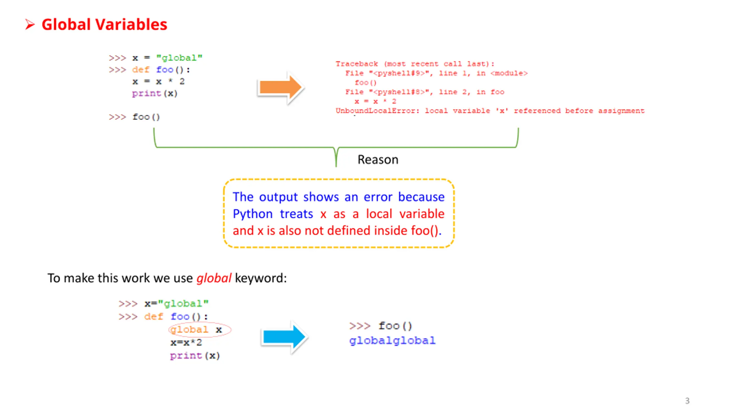 Global Variables Reason The output shows an error because Python treats x as a local variable and x is also not defined inside foo(). To make this work we use global keyword: 3
