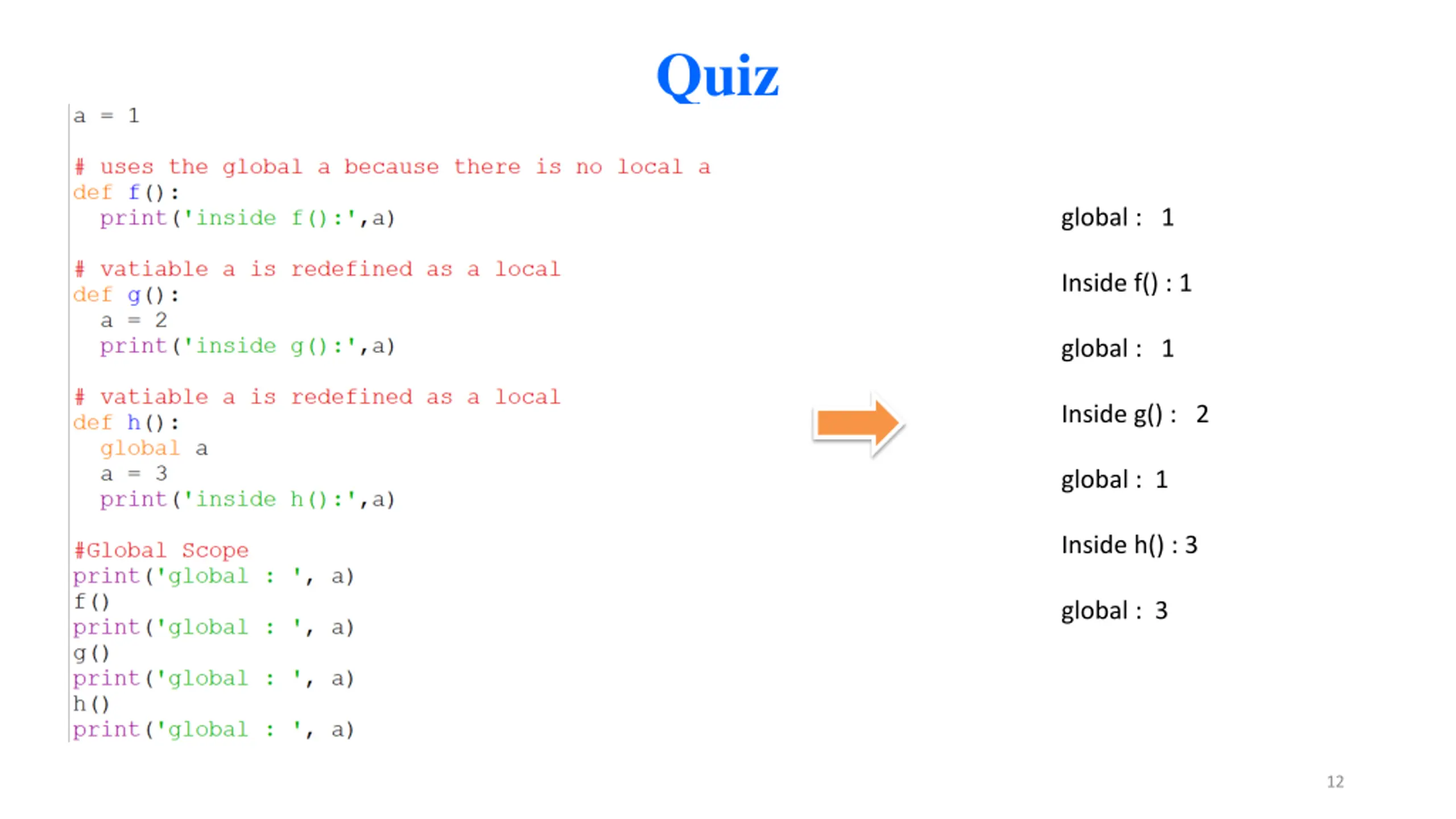 Quiz global : 1 Inside f() : 1 global : 1 Inside g() : 2 global : 1 Inside h() : 3 global : 3 12