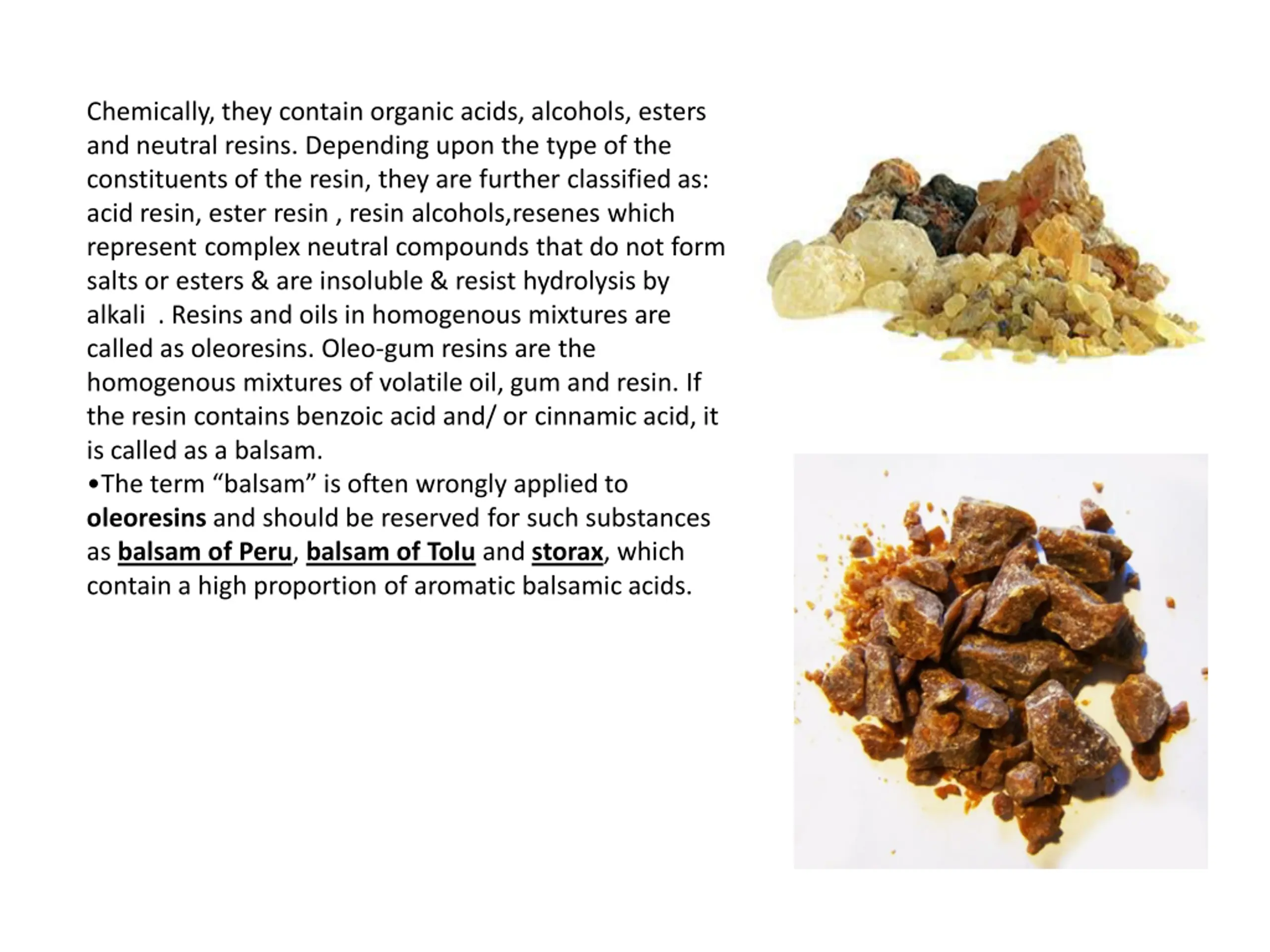 Chemically, they contain organic acids, alcohols, esters and neutral resins. Depending upon the type of the constituents of the resin, they are further classified as: acid resin, ester resin , resin alcohols,resenes which represent complex neutral compounds that do not form salts or esters & are insoluble & resist hydrolysis by alkali . Resins and oils in homogenous mixtures are called as oleoresins. Oleo-gum resins are the homogenous mixtures of volatile oil, gum and resin. If the resin contains benzoic acid and/ or cinnamic acid, it is called as a balsam. The term balsam is often wrongly applied to oleoresins and should be reserved for such substances as balsam of Peru, balsam ofTolu and storax, which contain a high proportion of aromatic balsamic acids. Image result for resins Related image