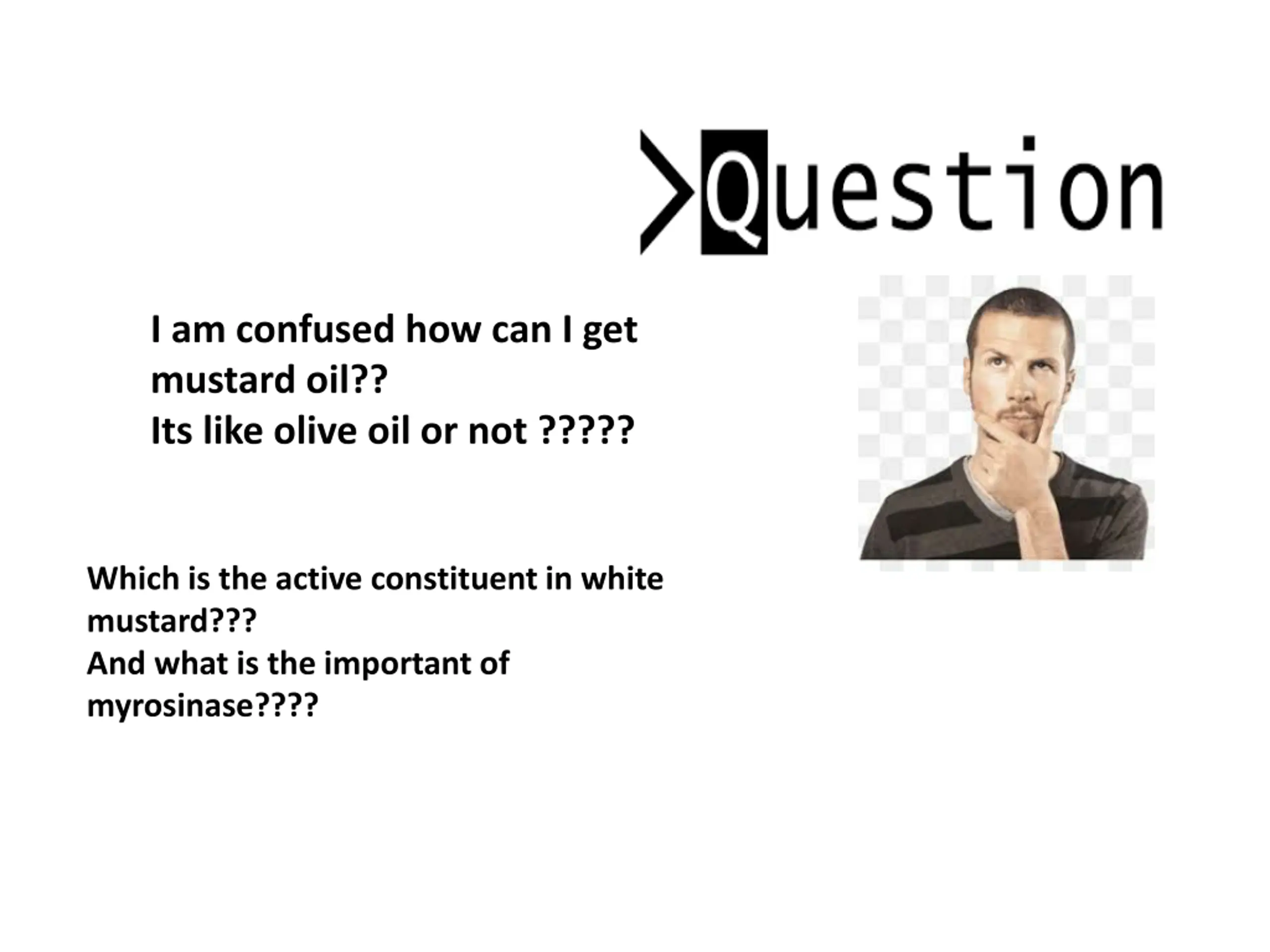 I am confused how can I get mustard oil?? Its like olive oil or not ????? Which is the active constituent in white mustard??? And what is the important of myrosinase????
