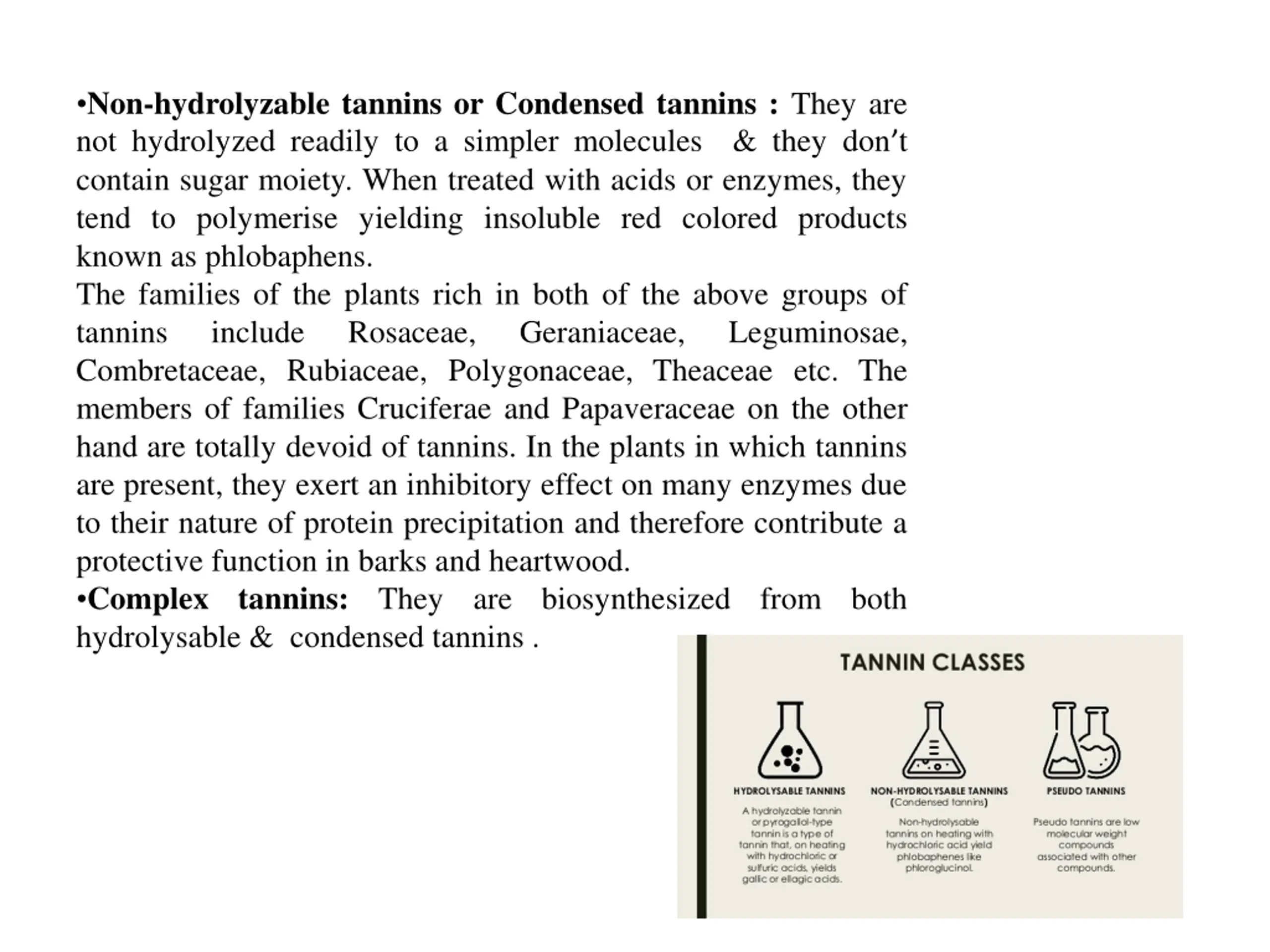 Non-hydrolyzable tannins or Condensed tannins : They are not hydrolyzed readily to a simpler molecules & they don t contain sugar moiety. When treated with acids or enzymes, they tend to polymerise yielding insoluble red colored products known as phlobaphens. The families of the plants rich in both of the above groups of tannins include Rosaceae, Combretaceae, Rubiaceae, Polygonaceae, Theaceae etc. The members of families Cruciferae and Papaveraceae on the other hand are totally devoid of tannins. In the plants in which tannins are present, they exert an inhibitory effect on many enzymes due to their nature of protein precipitation and therefore contribute a protective function in barks and heartwood. Complex tannins: They are biosynthesized from both hydrolysable & condensed tannins . Geraniaceae, Leguminosae, Image result for tannins plant