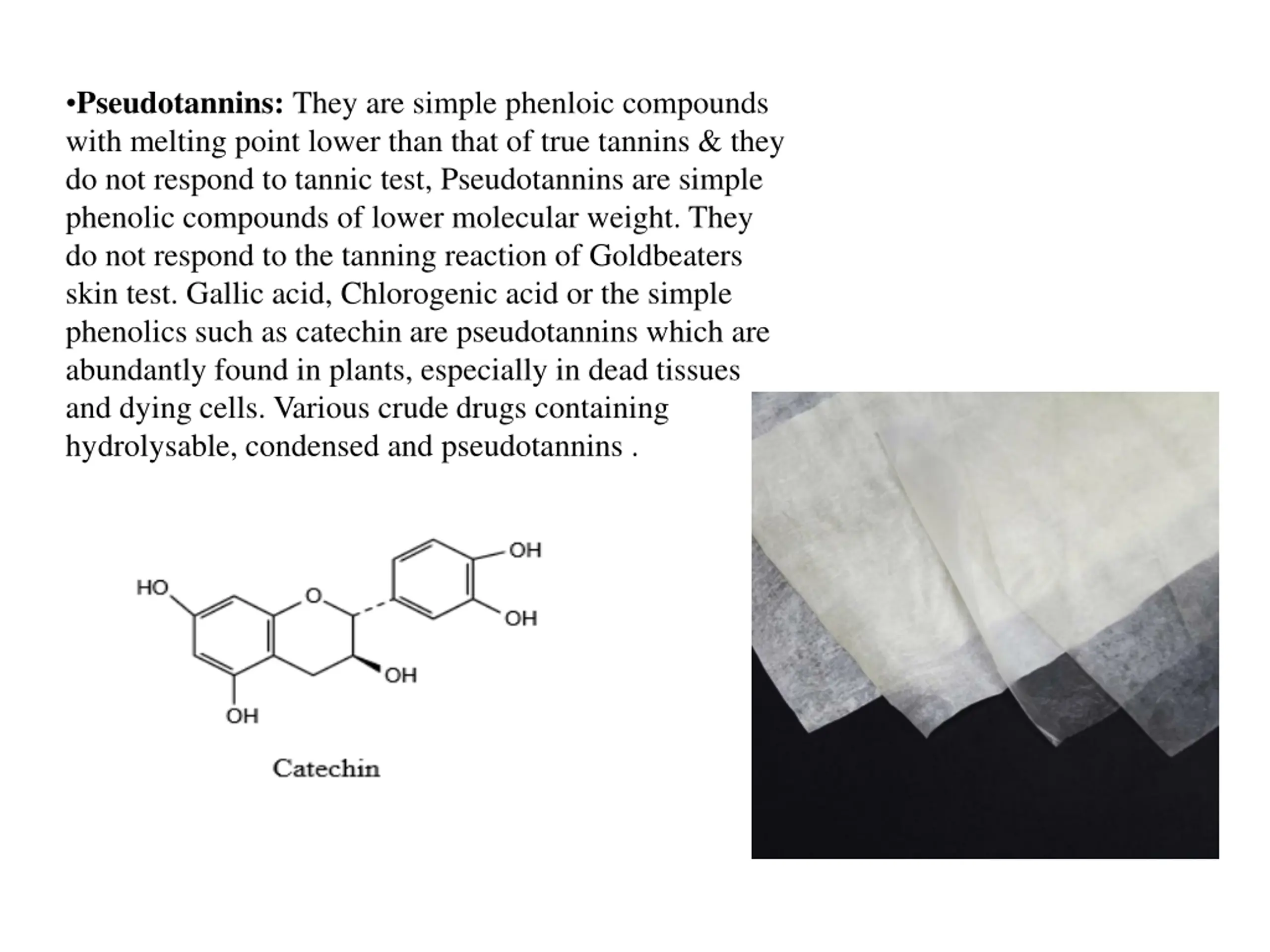 Pseudotannins: They are simple phenloic compounds with melting point lower than that of true tannins & they do not respond to tannic test, Pseudotannins are simple phenolic compounds of lower molecular weight. They do not respond to the tanning reaction of Goldbeaters skin test. Gallic acid, Chlorogenic acid or the simple phenolics such as catechin are pseudotannins which are abundantly found in plants, especially in dead tissues and dying cells. Various crude drugs containing hydrolysable, condensed and pseudotannins . Related image