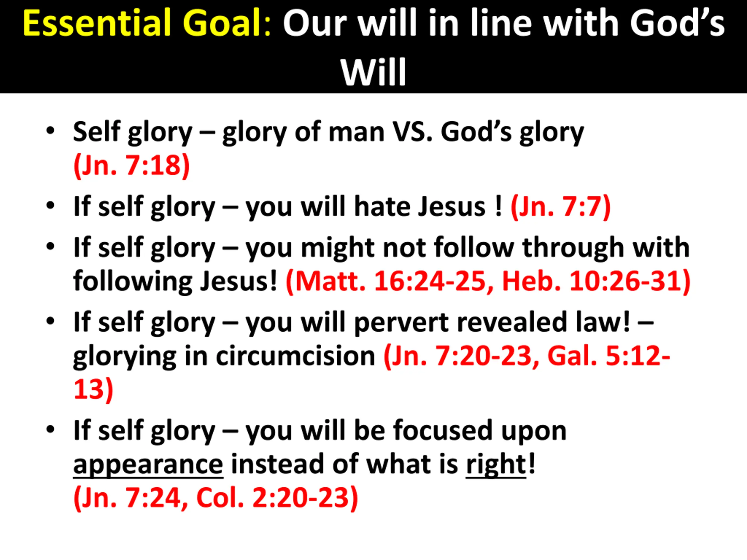 Essential Goal: Our will in line with Gods Will Self glory glory of man VS. God s glory (Jn. 7:18) If self glory you will hate Jesus ! (Jn. 7:7) If self glory you might not follow through with following Jesus! (Matt. 16:24-25, Heb. 10:26-31) If self glory you will pervert revealed law! glorying in circumcision (Jn. 7:20-23, Gal. 5:12- 13) If self glory you will be focused upon appearance instead of what is right! (Jn. 7:24, Col. 2:20-23)