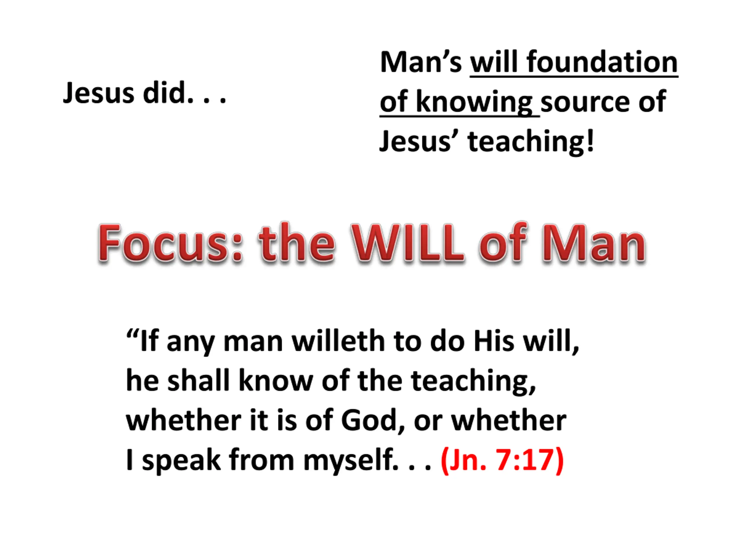 Mans will foundation of knowing source of Jesus teaching! Jesus did. . . If any man willeth to do His will, he shall know of the teaching, whether it is of God, or whether I speak from myself. . . (Jn. 7:17)