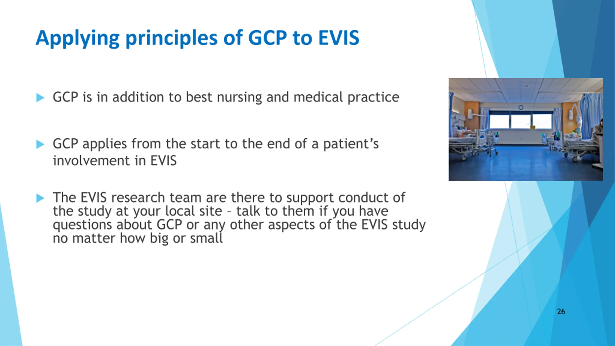 Applying principles of GCP to EVIS GCP is in addition to best nursing and medical practice GCP applies from the start to the end of a patient s involvement in EVIS The EVIS research team are there to support conduct of the study at your local site talk to them if you have questions about GCP or any other aspects of the EVIS study no matter how big or small 26