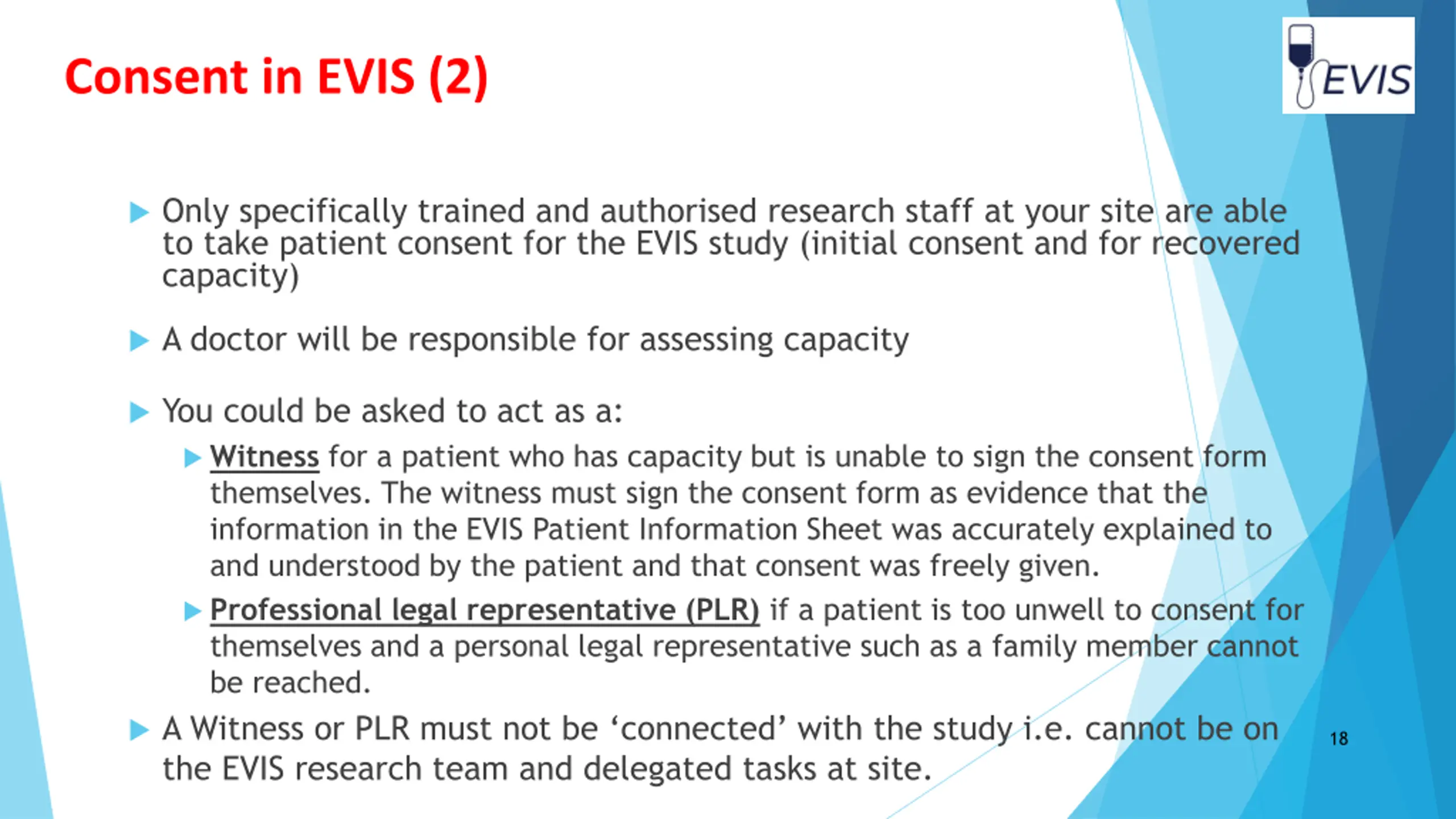 Consent in EVIS (1) Obtaining consent in EVIS may be a little more complex as some patients will lack capacity to consent due to their presenting illness There is specific legislation for obtaining consent in Adults with Incapacity. Consent may be sought from a personal (eg. relative of patient) or professional (eg. doctor or nurse) legal representative Once the patient recovers capacity to consent they will be given written information on the study that explains what has happened to them so far and seek their written consent for continued involvement in the study 17