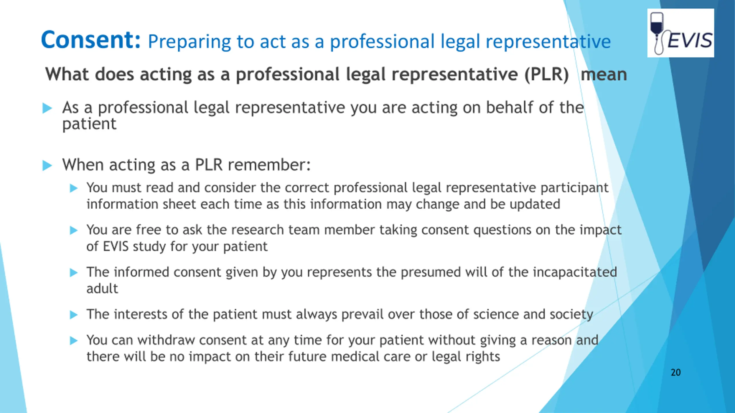 Consent: Preparing to act as a professional legal representative What does acting as a professional legal representative (PLR) mean As a professional legal representative you are acting on behalf of the patient When acting as a PLR remember: You must read and consider the correct professional legal representative participant information sheet each time as this information may change and be updated You are free to ask the research team member taking consent questions on the impact of EVIS study for your patient The informed consent given by you represents the presumed will of the incapacitated adult The interests of the patient must always prevail over those of science and society You can withdraw consent at any time for your patient without giving a reason and there will be no impact on their future medical care or legal rights 20