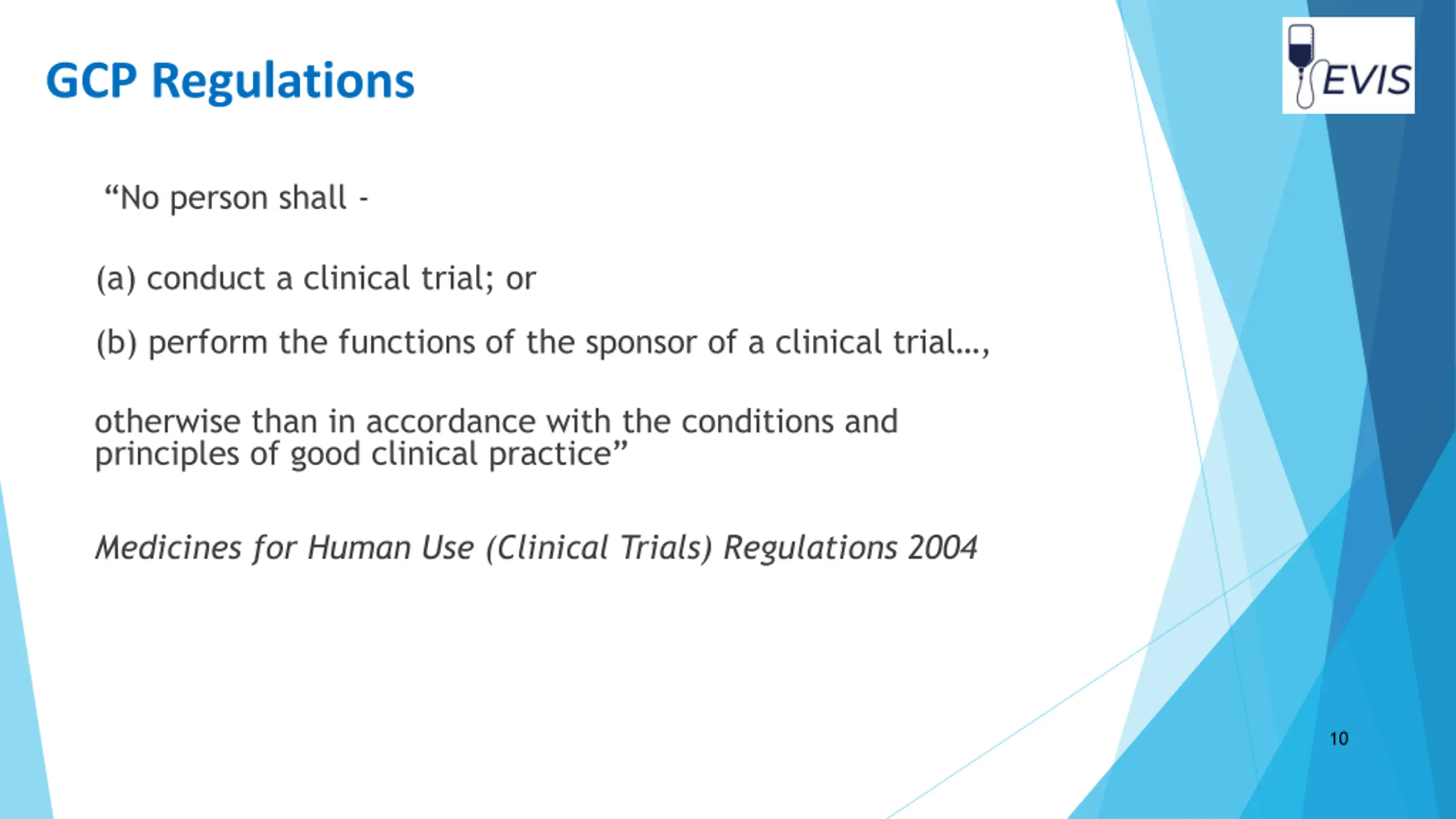 GCP Regulations No person shall - (a) conduct a clinical trial; or (b) perform the functions of the sponsor of a clinical trial , otherwise than in accordance with the conditions and principles of good clinical practice Medicines for Human Use (Clinical Trials) Regulations 2004 10