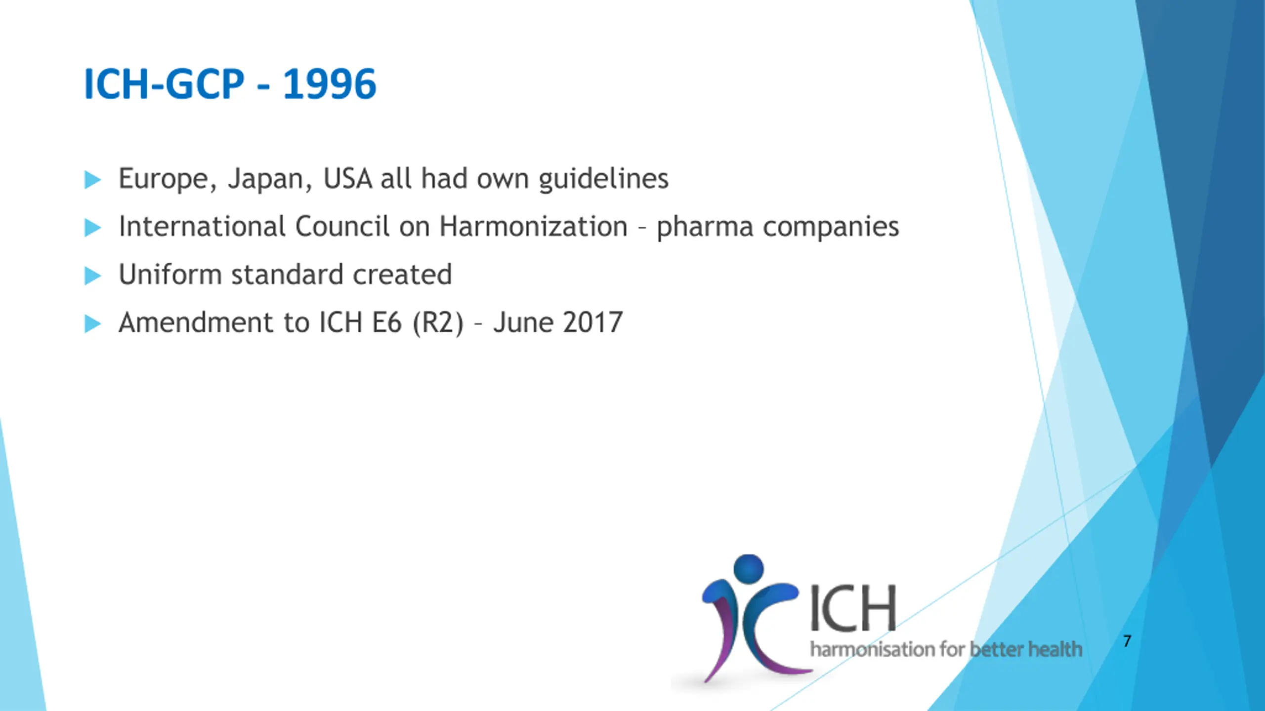 ICH-GCP - 1996 Europe, Japan, USA all had own guidelines International Council on Harmonization pharma companies Uniform standard created Amendment to ICH E6 (R2) June 2017 ICH 7