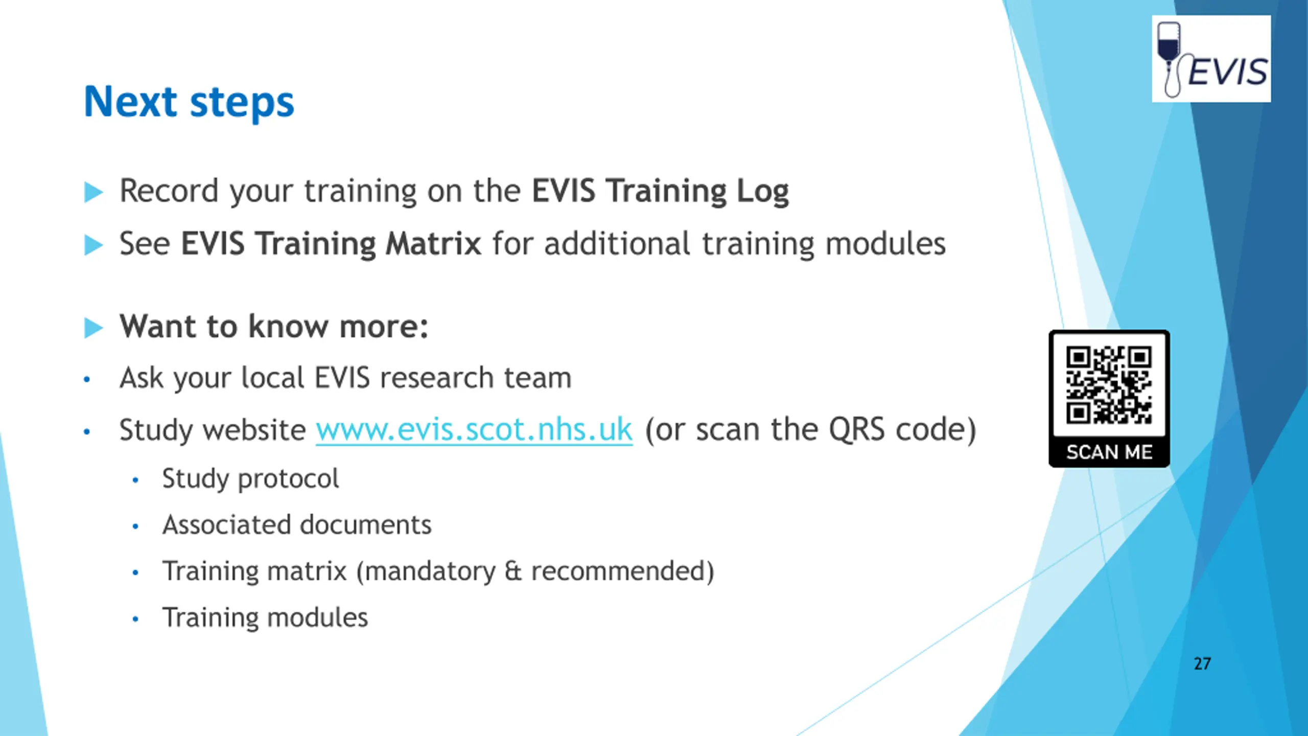 Next steps Record your training on the EVIS Training Log See EVIS Training Matrix for additional training modules Want to know more: Ask your local EVIS research team Study website www.evis.scot.nhs.uk (or scan the QRS code) Study protocol Associated documents Training matrix (mandatory & recommended) Training modules 27