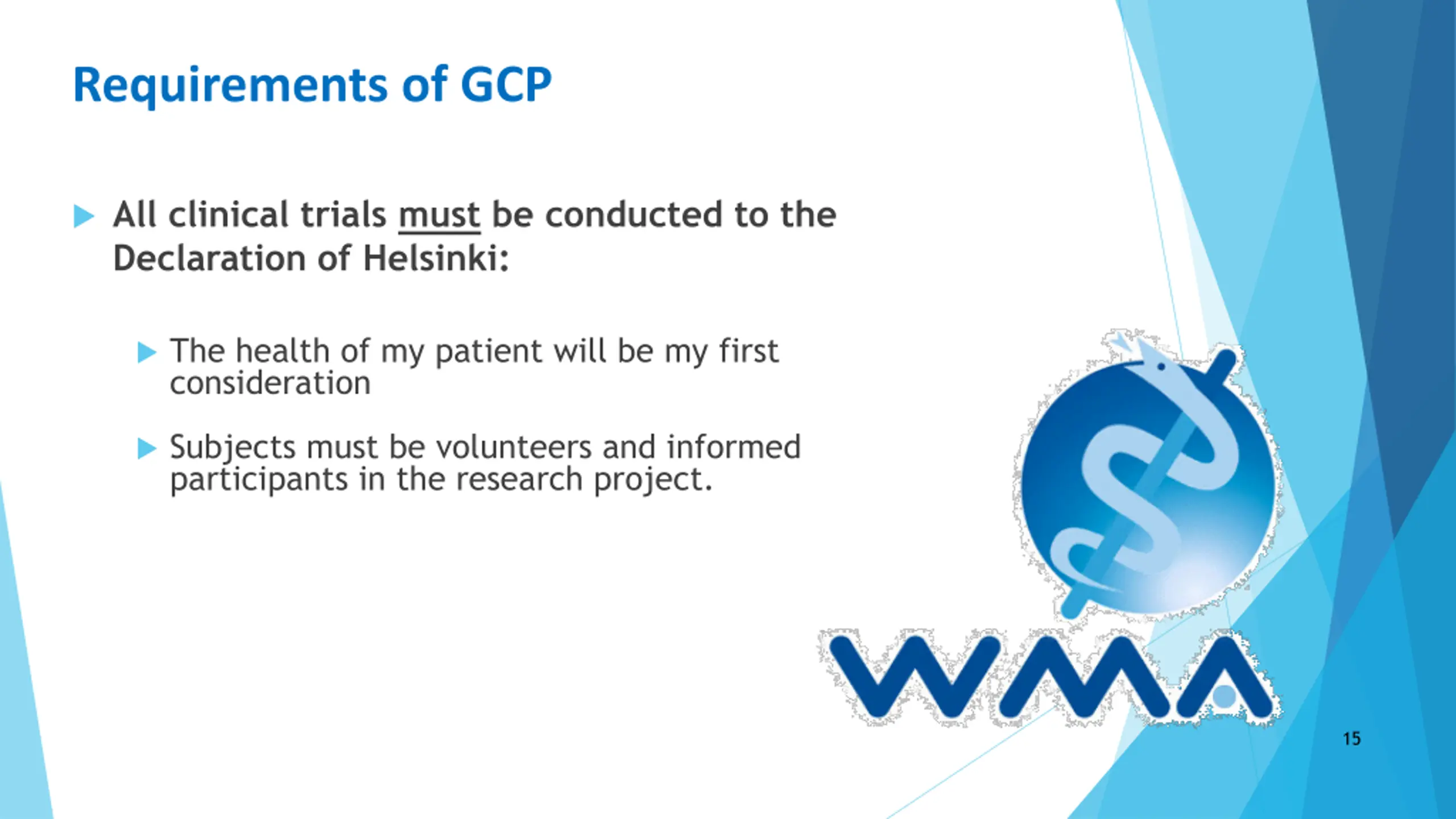 Requirementsof GCP All clinical trials must be conducted to the Declaration of Helsinki: The health of my patient will be my first consideration Subjects must be volunteers and informed participants in the research project. 15
