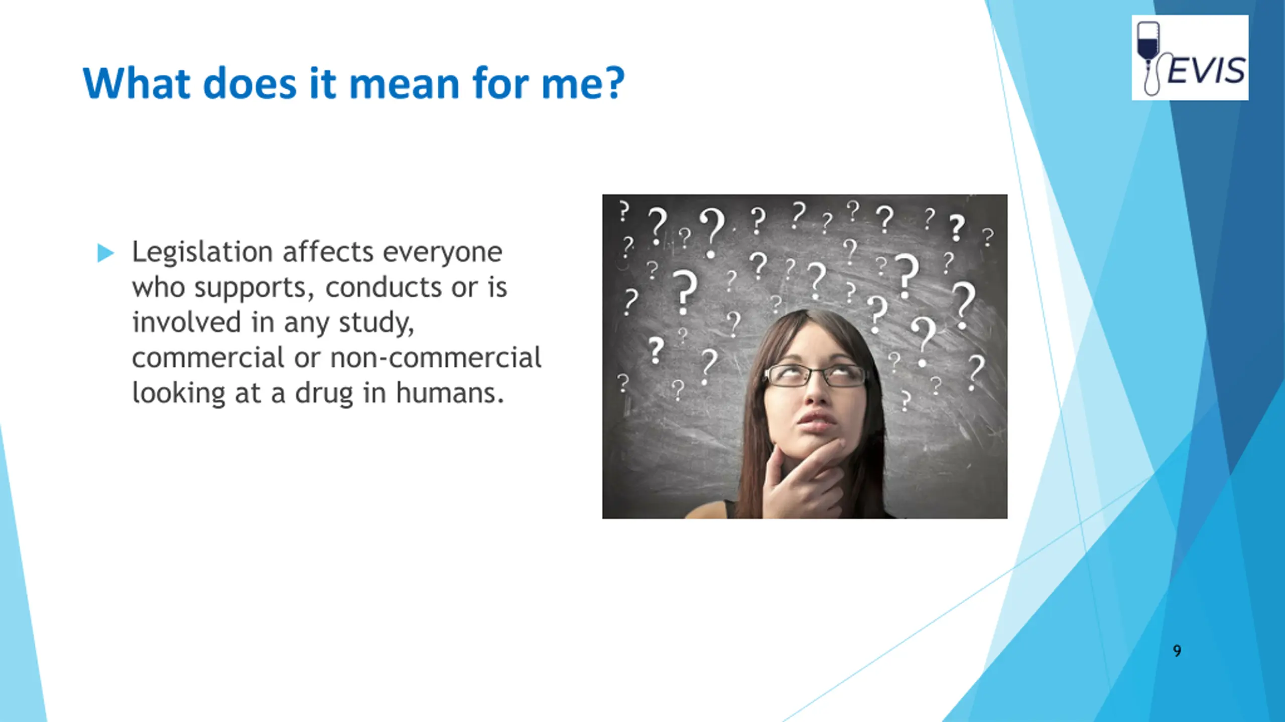 What does it mean for me? Legislation affects everyone who supports, conducts or is involved in any study, commercial or non-commercial looking at a drug in humans. 9