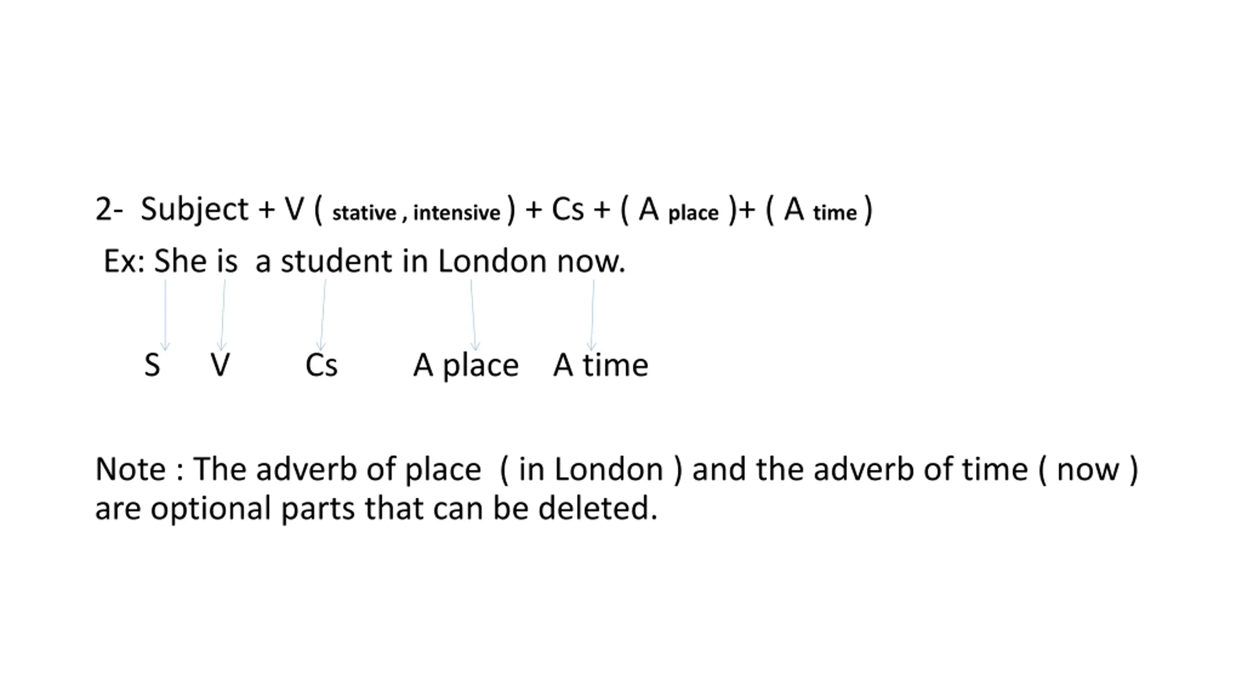 2- Subject + V ( stative , intensive ) + Cs + ( A place )+ ( A time ) Ex: She is a student in London now. S V Cs A place A time Note : The adverb of place ( in London ) and the adverb of time ( now ) are optional parts that can be deleted.