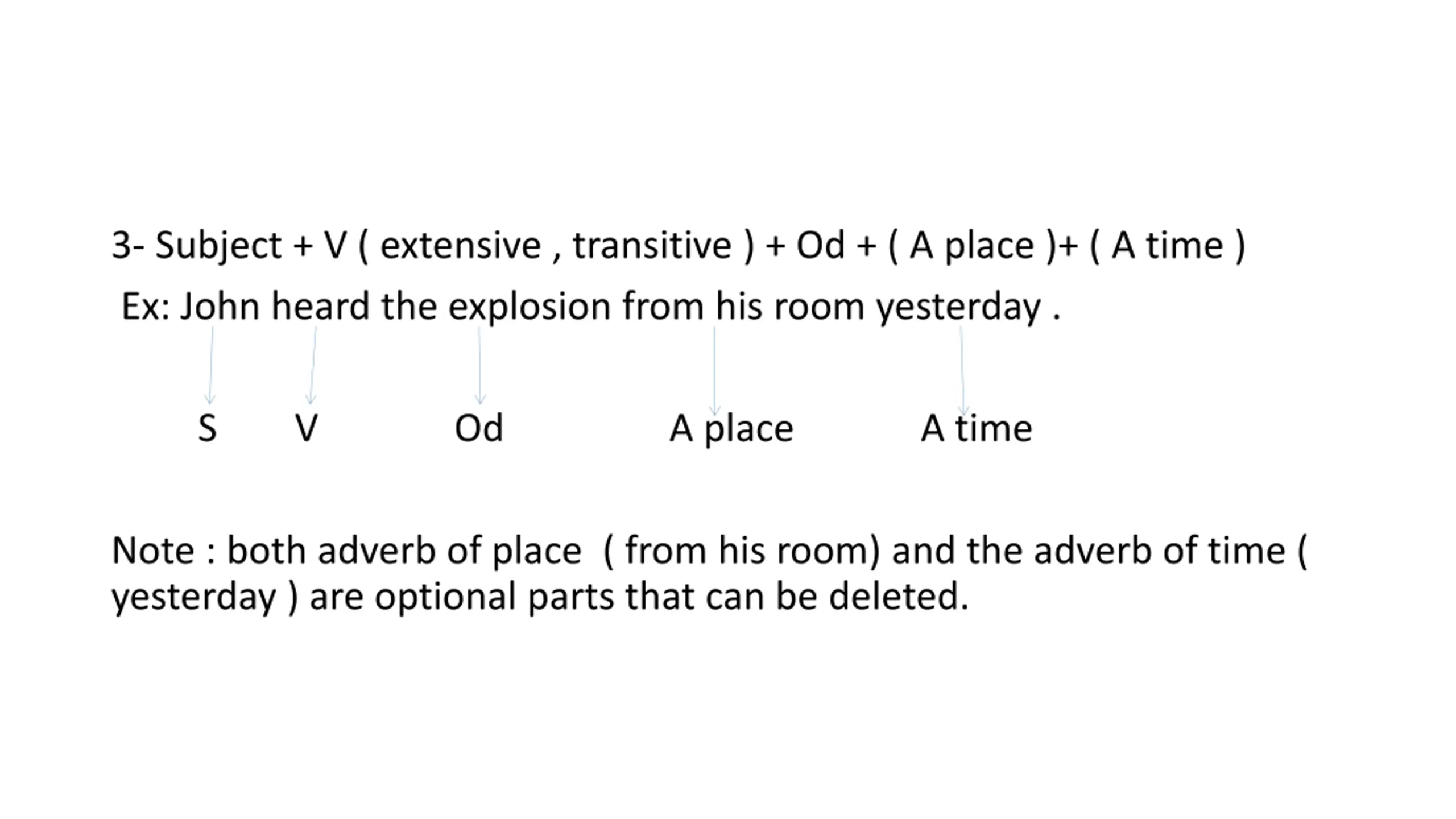 3- Subject + V ( extensive , transitive ) + Od + ( A place )+ ( A time ) Ex: John heard the explosion from his room yesterday . S V Od A place A time Note : both adverb of place ( from his room) and the adverb of time ( yesterday ) are optional parts that can be deleted.