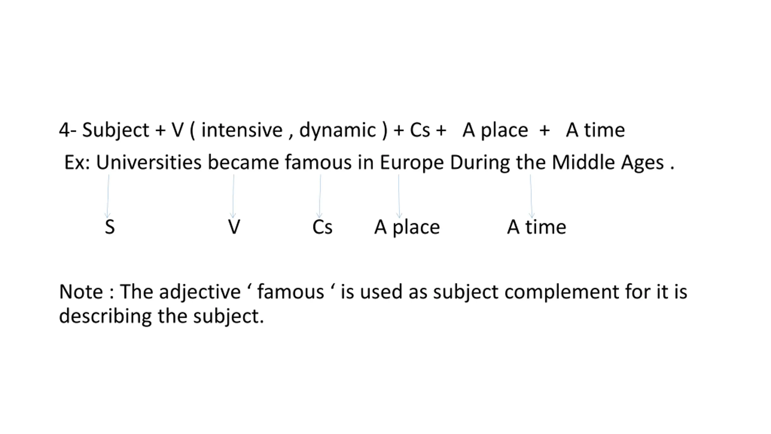 4- Subject + V ( intensive , dynamic ) + Cs + A place + A time Ex: Universities became famous in Europe During the Middle Ages . S V Cs A place A time Note : The adjective famous is used as subject complement for it is describing the subject.
