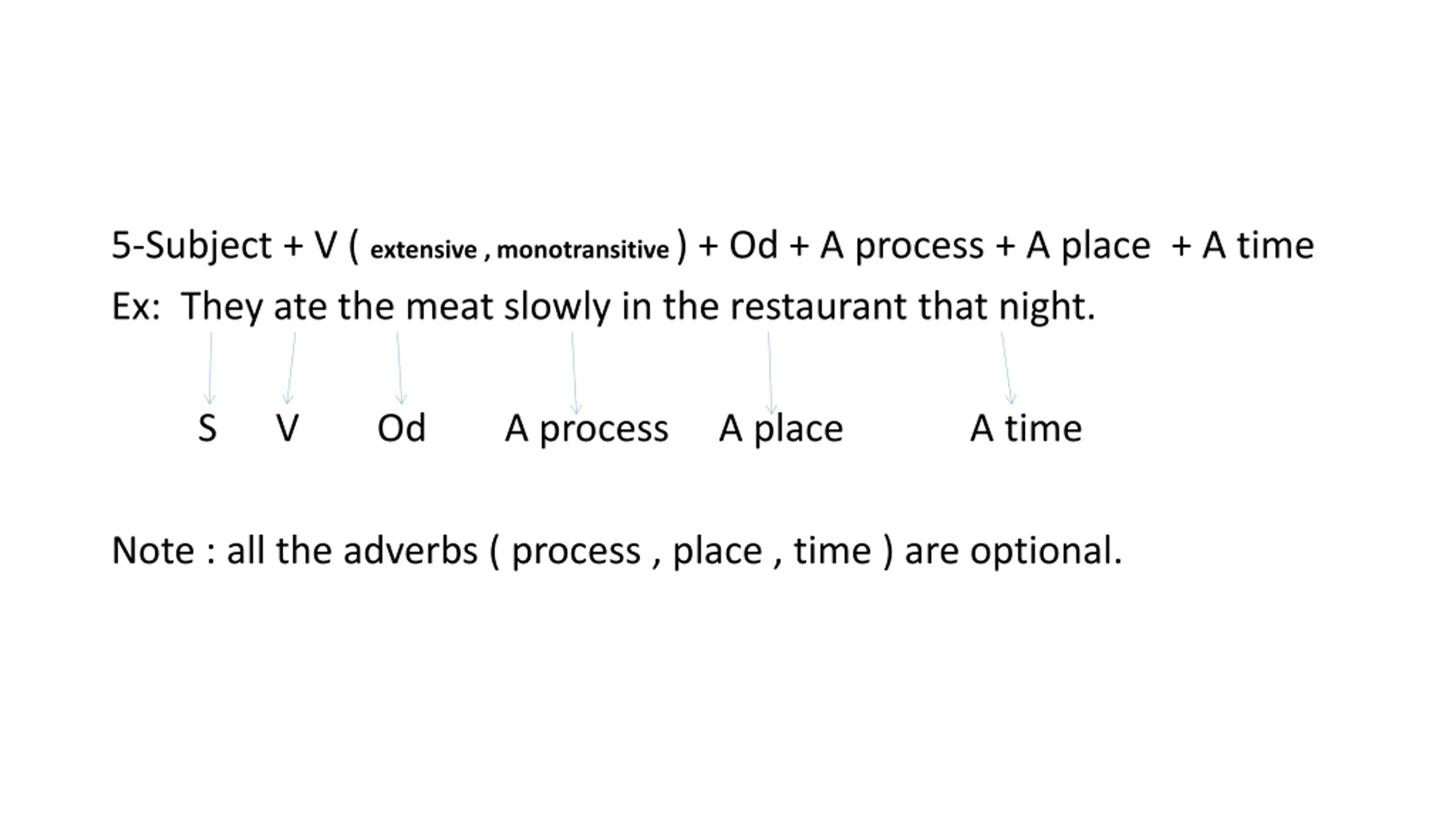 5-Subject + V ( extensive , monotransitive ) + Od + A process + A place + A time Ex: They ate the meat slowly in the restaurant that night. S V Od A process A place A time Note : all the adverbs ( process , place , time ) are optional.