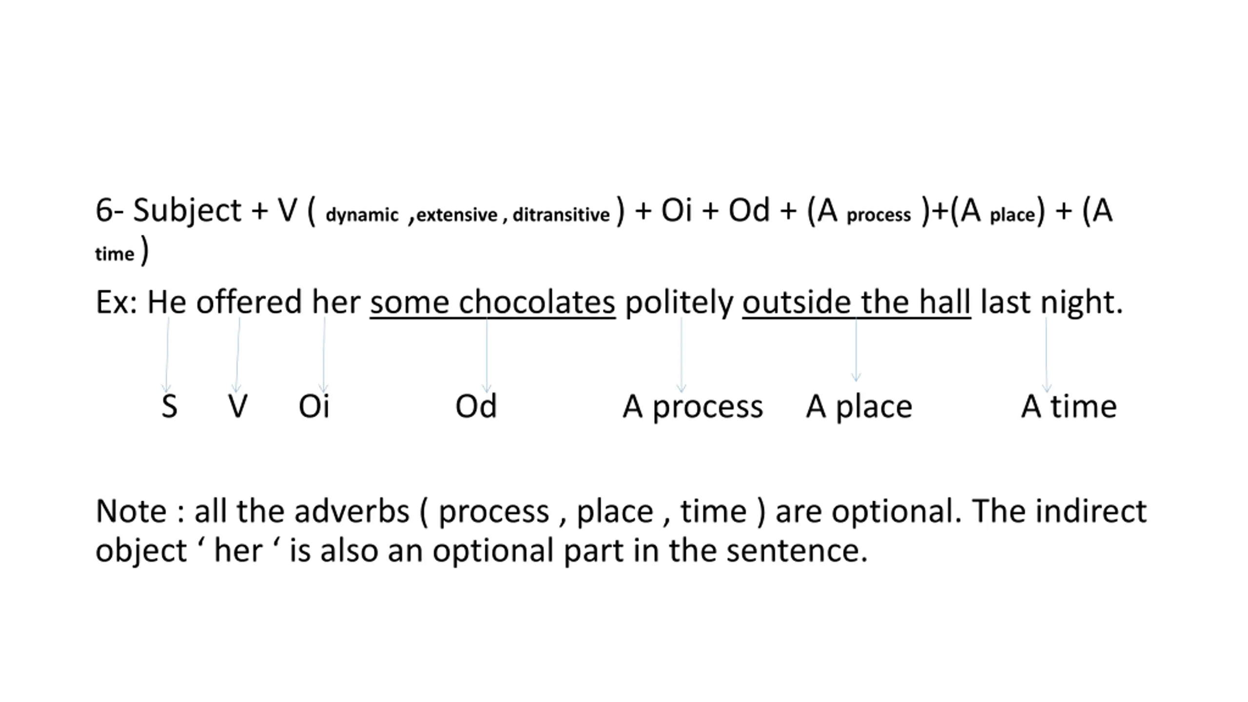 6- Subject + V ( dynamic ,extensive , ditransitive ) + Oi + Od + (A process )+(A place) + (A time ) Ex: He offered her some chocolates politely outside the hall last night. S V Oi Od A process A place A time Note : all the adverbs ( process , place , time ) are optional. The indirect object her is also an optional part in the sentence.