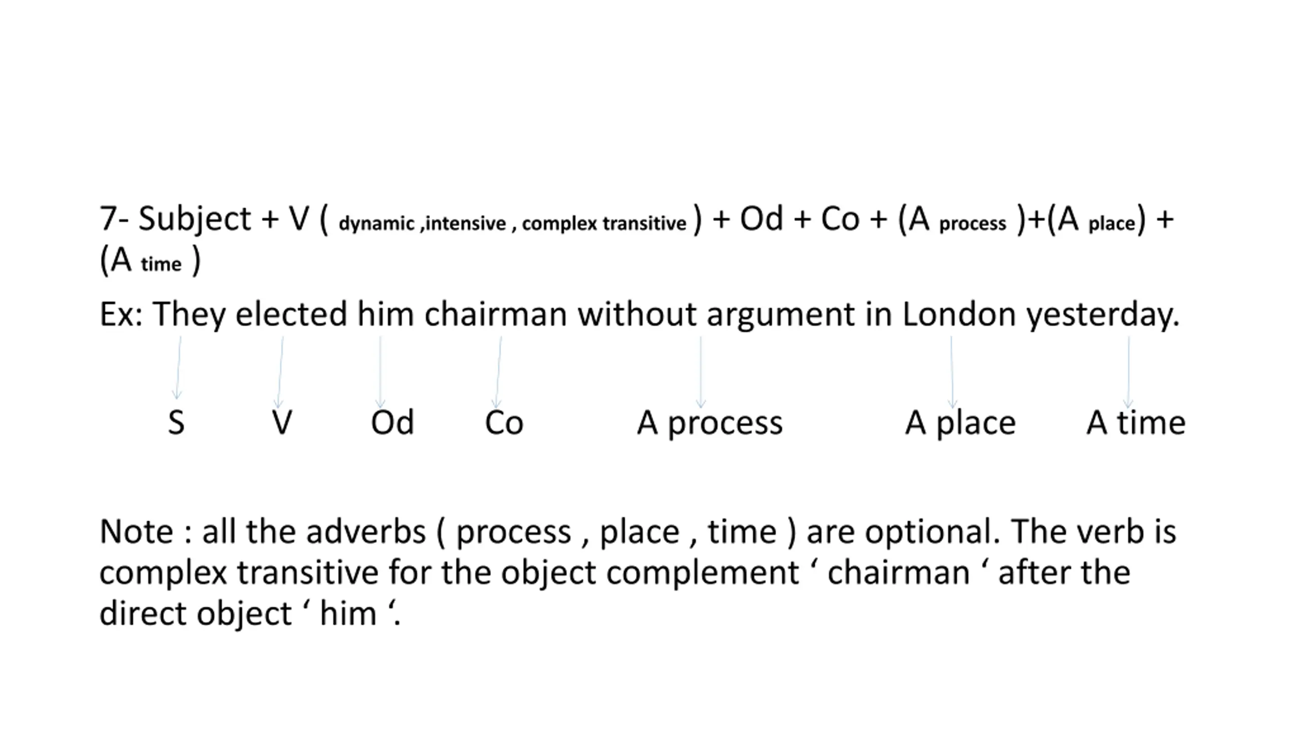 7- Subject + V ( dynamic ,intensive , complex transitive ) + Od + Co + (A process )+(A place) + (A time ) Ex: They elected him chairman without argument in London yesterday. S V Od Co A process A place A time Note : all the adverbs ( process , place , time ) are optional. The verb is complex transitive for the object complement chairman after the direct object him .