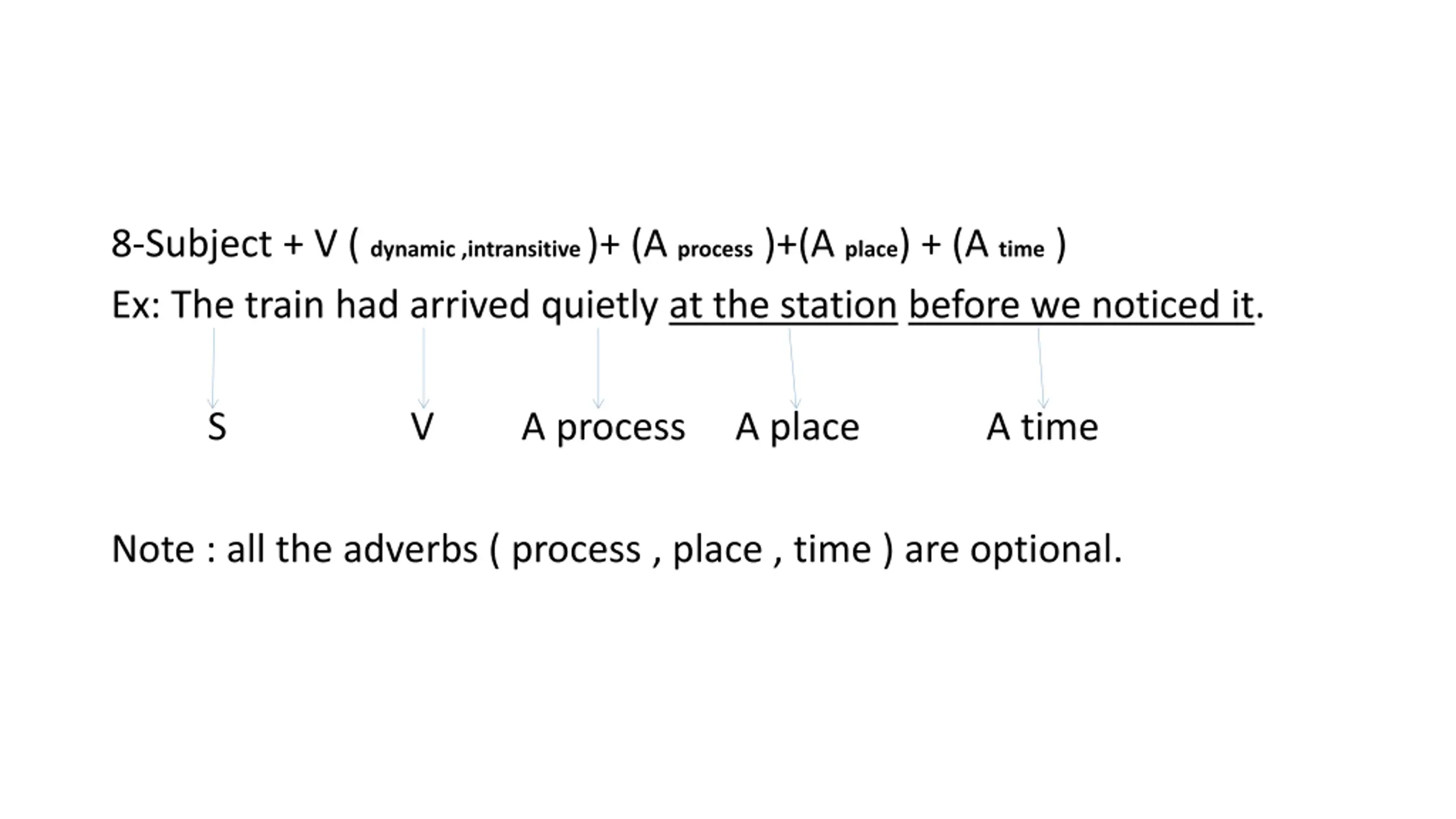 8-Subject + V ( dynamic ,intransitive )+ (A process )+(A place) + (A time ) Ex: The train had arrived quietly at the station before we noticed it. S V A process A place A time Note : all the adverbs ( process , place , time ) are optional.