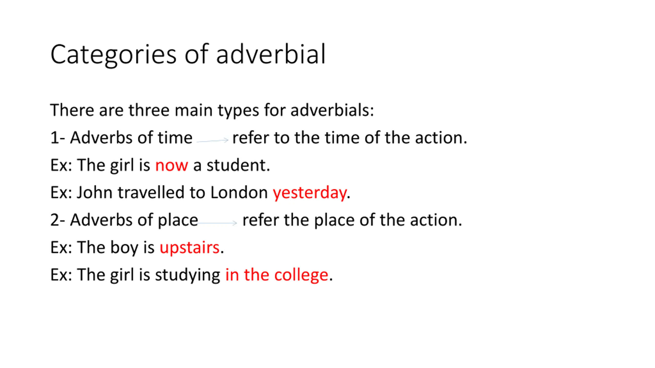 Categories of adverbial There are three main types for adverbials: 1- Adverbs of time refer to the time of the action. Ex: The girl is now a student. Ex: John travelled to London yesterday. 2- Adverbs of place refer the place of the action. Ex: The boy is upstairs. Ex: The girl is studying in the college.