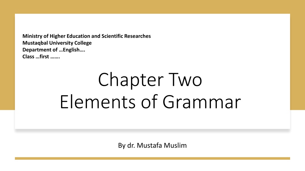 Ministry of Higher Education and Scientific Researches Mustaqbal University College Department of English . Class first . Chapter Two Elements of Grammar By dr. Mustafa Muslim