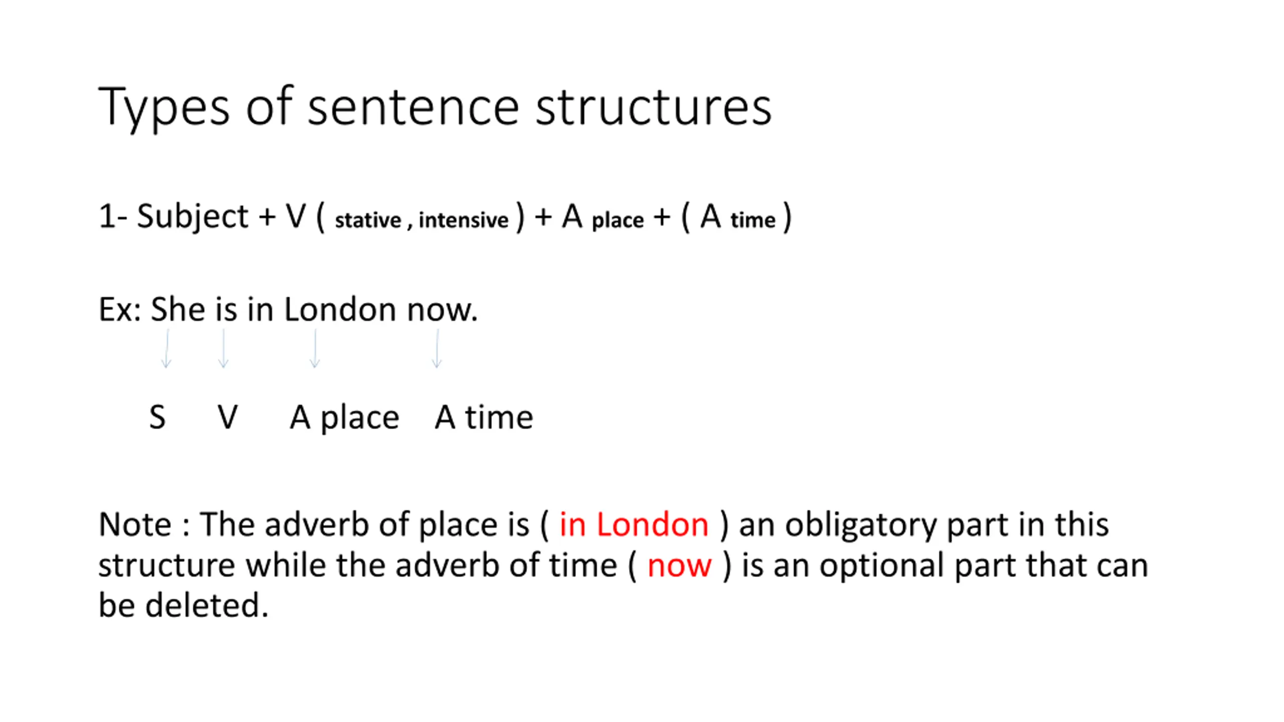Types of sentence structures 1- Subject + V ( stative , intensive ) + A place + ( A time ) Ex: She is in London now. S V A place A time Note : The adverb of place is ( in London ) an obligatory part in this structure while the adverb of time ( now ) is an optional part that can be deleted.