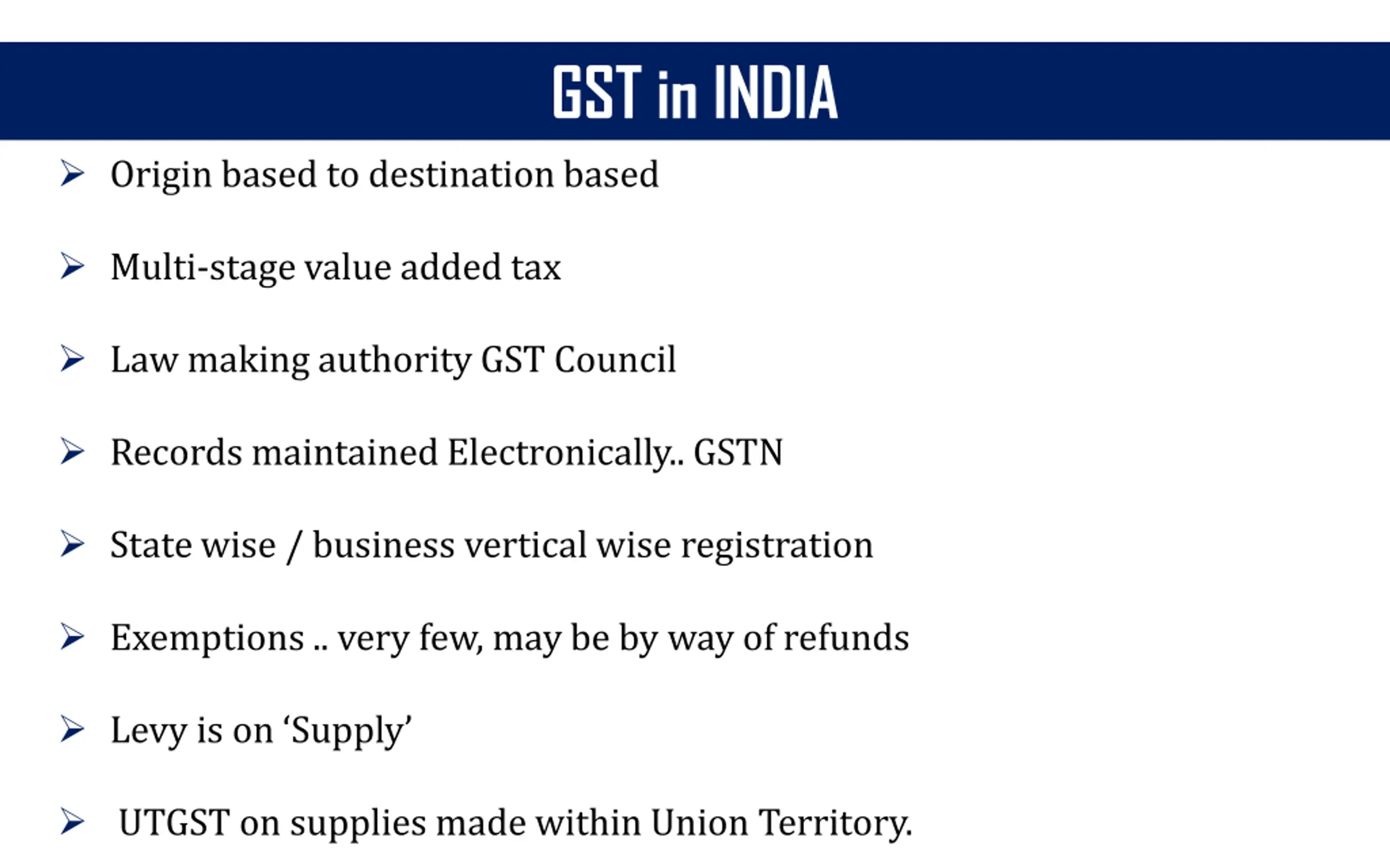GST in INDIA Origin based to destination based Multi-stage value added tax Law making authority GST Council Records maintained Electronically.. GSTN State wise / business vertical wise registration Exemptions .. very few, may be by way of refunds Levy is on Supply UTGST on supplies made within Union Territory.