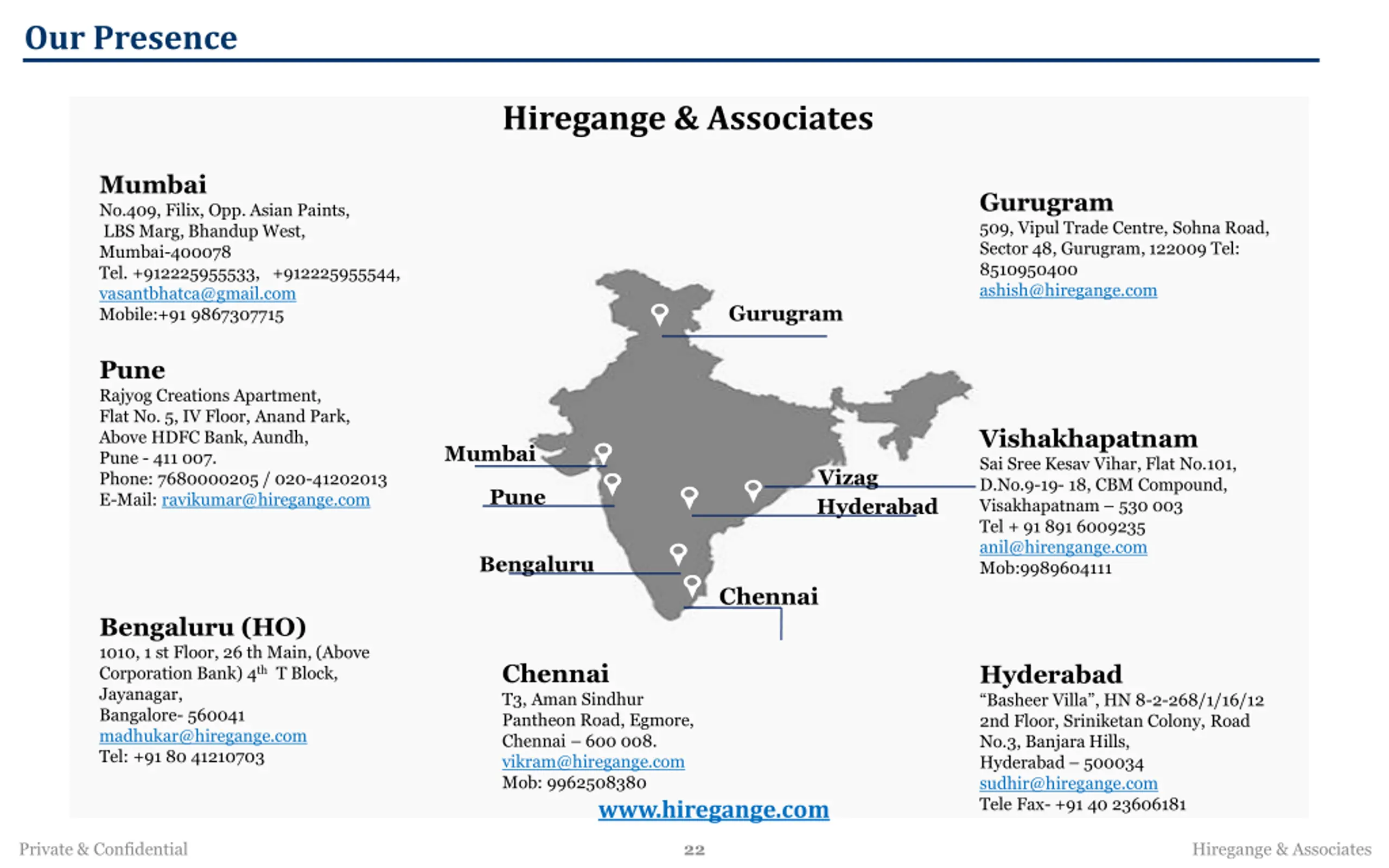 Our Presence Hiregange & Associates Mumbai No.409, Filix, Opp. Asian Paints, LBS Marg, Bhandup West, Mumbai-400078 Tel. +912225955533, +912225955544, vasantbhatca@gmail.com Mobile:+91 9867307715 Gurugram 509, Vipul Trade Centre, Sohna Road, Sector 48, Gurugram, 122009 Tel: 8510950400 ashish@hiregange.com Gurugram Pune Rajyog Creations Apartment, Flat No. 5, IV Floor, Anand Park, Above HDFC Bank, Aundh, Pune - 411 007. Phone: 7680000205 / 020-41202013 E-Mail: ravikumar@hiregange.com Vishakhapatnam Sai Sree Kesav Vihar, Flat No.101, D.No.9-19- 18, CBM Compound, Visakhapatnam 530 003 Tel + 91 891 6009235 anil@hirengange.com Mob:9989604111 Mumbai Vizag Hyderabad Pune Bengaluru Chennai Bengaluru (HO) 1010, 1 st Floor, 26 th Main, (Above Corporation Bank) 4th T Block, Jayanagar, Bangalore- 560041 madhukar@hiregange.com Tel: +91 80 41210703 Chennai T3, Aman Sindhur Pantheon Road, Egmore, Chennai 600 008. vikram@hiregange.com Mob: 9962508380 Hyderabad Basheer Villa , HN 8-2-268/1/16/12 2nd Floor, Sriniketan Colony, Road No.3, Banjara Hills, Hyderabad 500034 sudhir@hiregange.com Tele Fax- +91 40 23606181 www.hiregange.com Private & Confidential 22 Hiregange & Associates